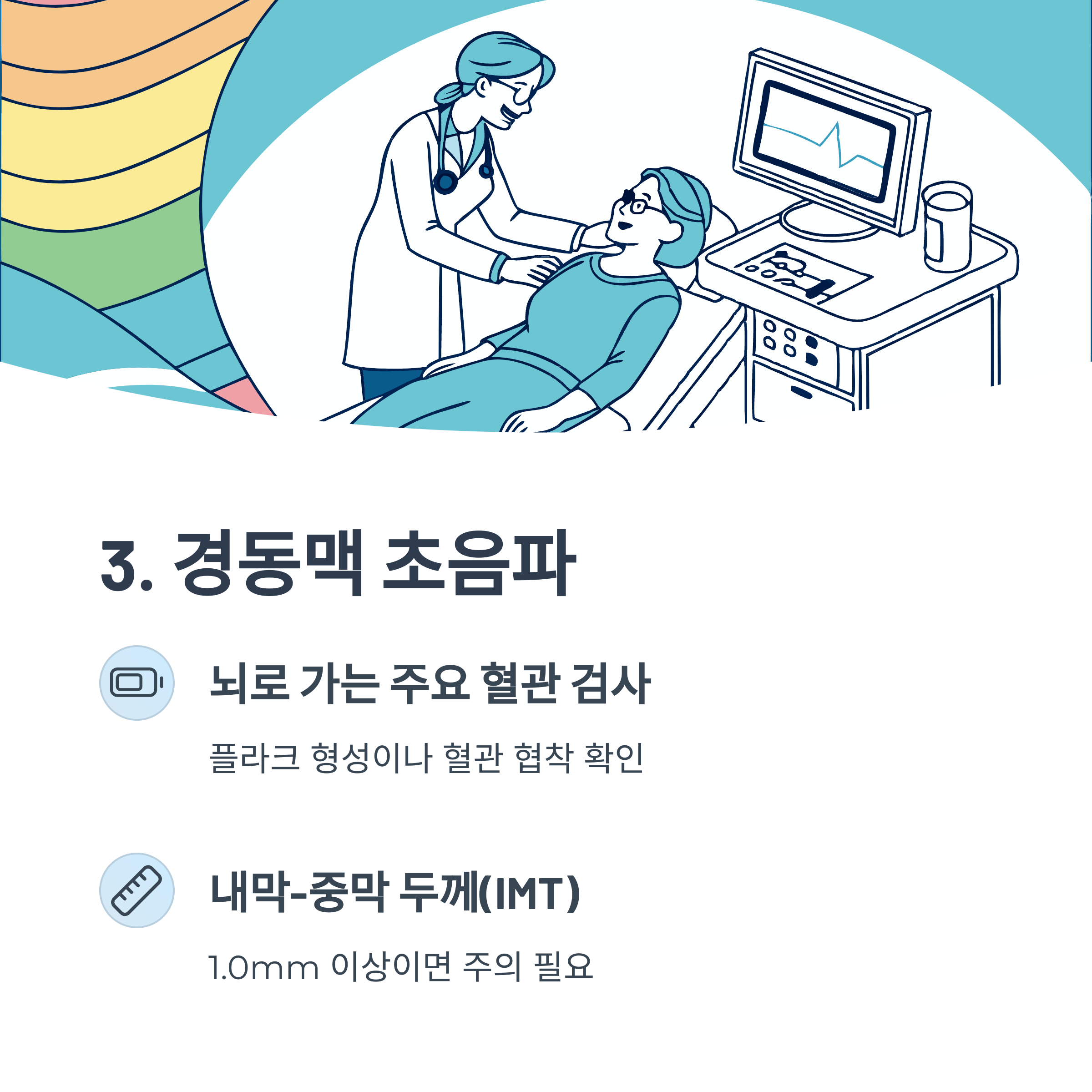 경동맥 초음파는 비침습적으로 동맥경화 정도를 파악할 수 있는 효과적인 검사이며, 내막-중막 두께(IMT)가 1.0mm 이상이면 주의가 필요합니다.