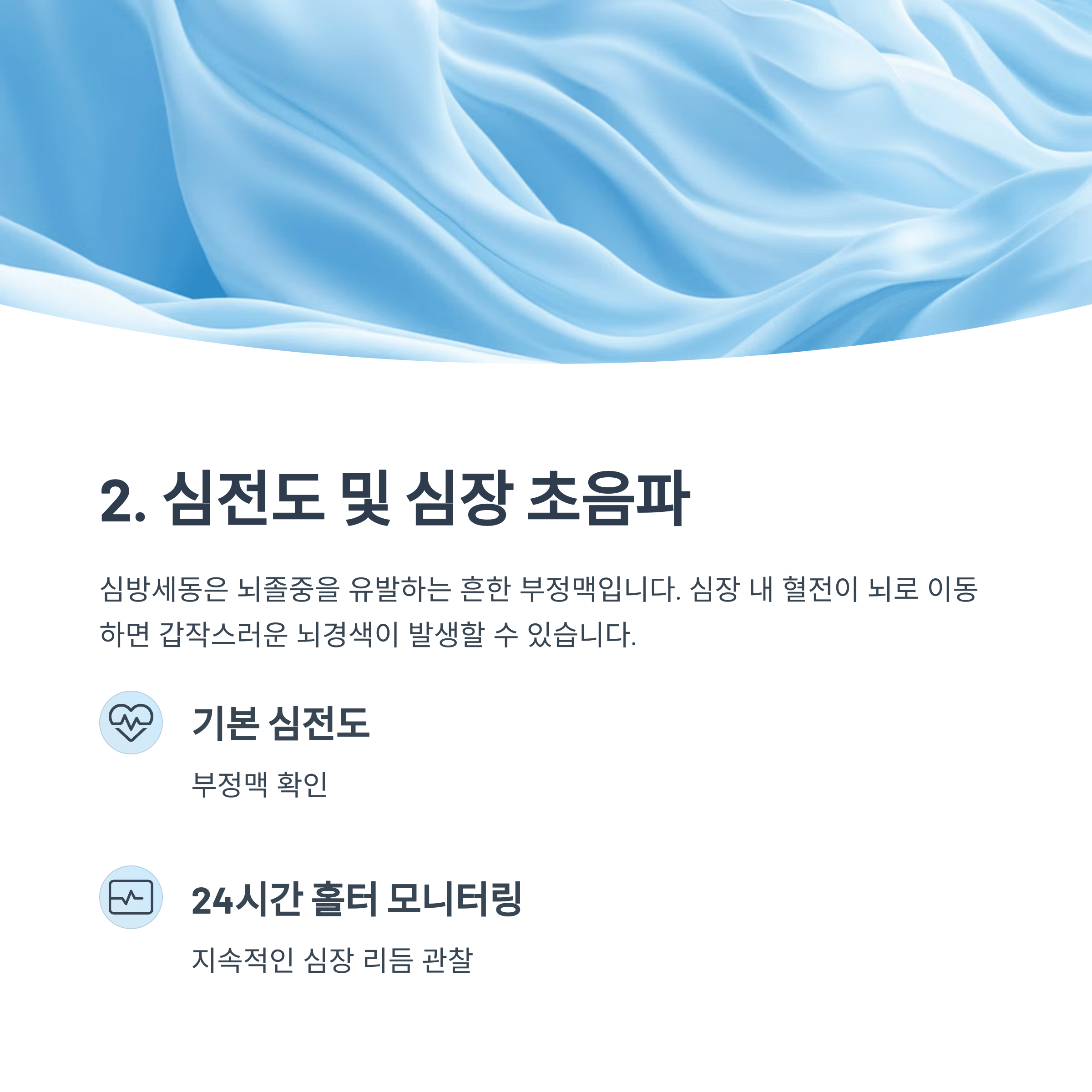 기본 심전도뿐 아니라 24시간 홀터 모니터링, 심장 초음파를 통해 부정맥 및 혈전 유무를 확인하는 것이 중요합니다.