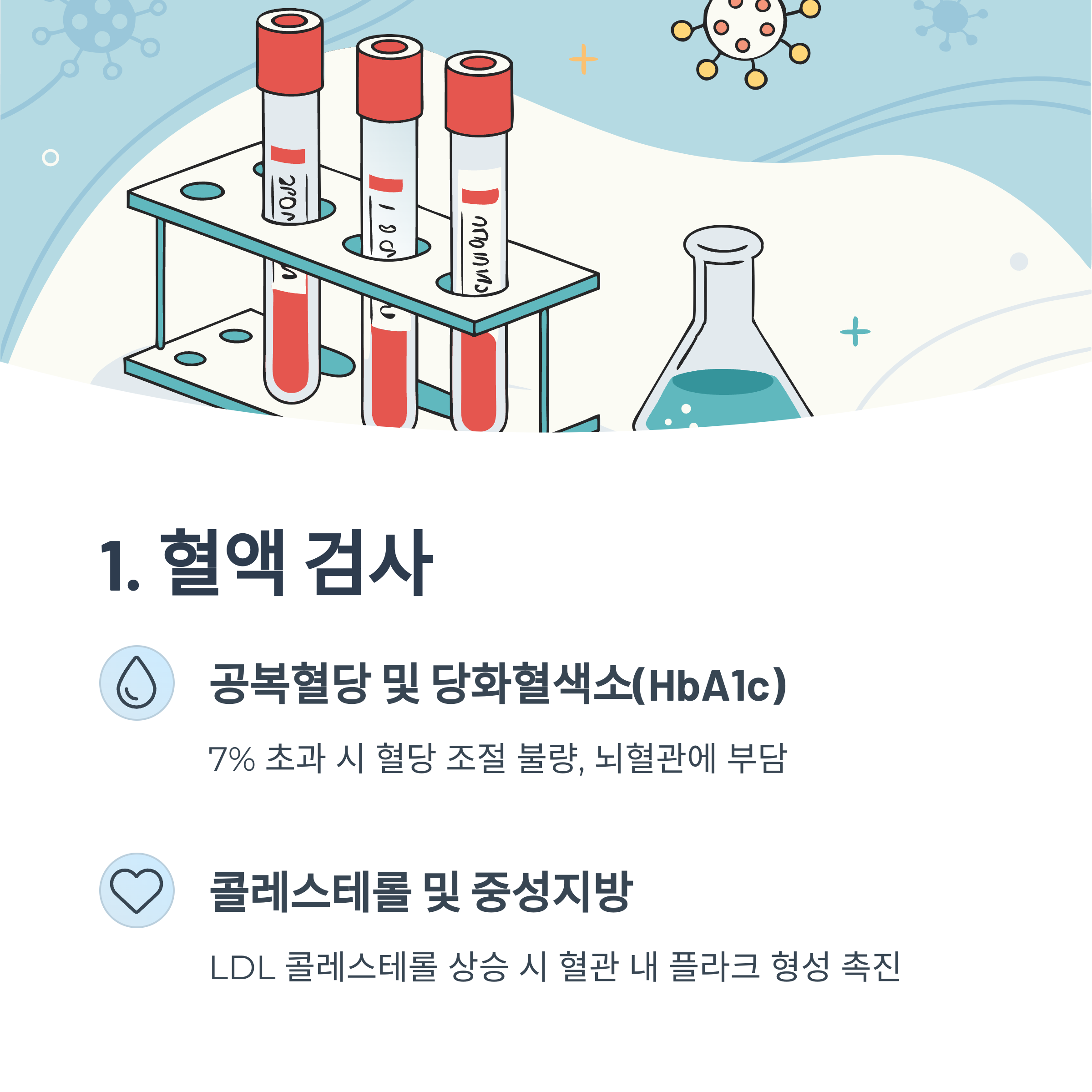 공복혈당, 당화혈색소(HbA1c), 콜레스테롤, 중성지방, 신장 기능 수치를 통해 전반적인 혈관 건강 상태를 알 수 있습니다.