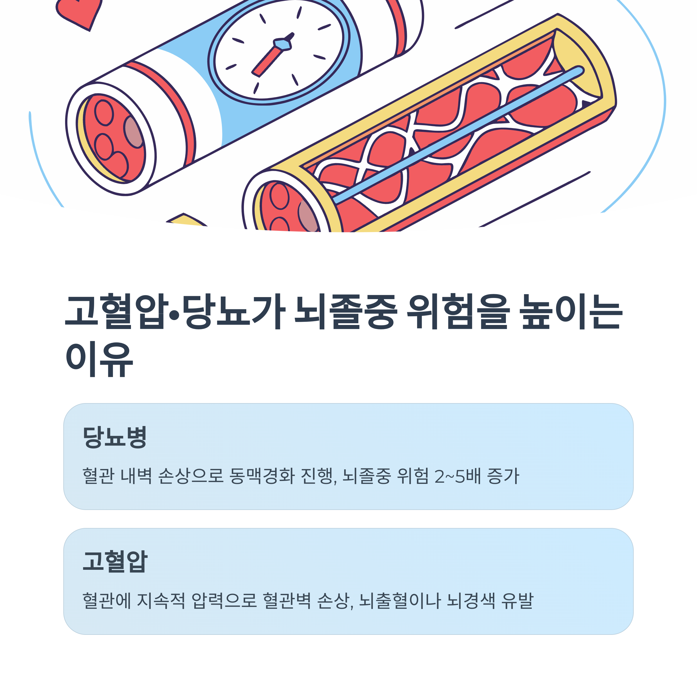 당뇨병은 혈관 내벽에 손상을 주는 만성질환입니다. 혈당이 지속적으로 높으면 동맥경화가 빠르게 진행되고, 이는 뇌혈류를 막아 뇌경색을 일으킬 수 있습니다. 실제로 당뇨 환자는 일반인보다 뇌졸중 위험이 2~5배가량 높다고 알려져 있습니다.