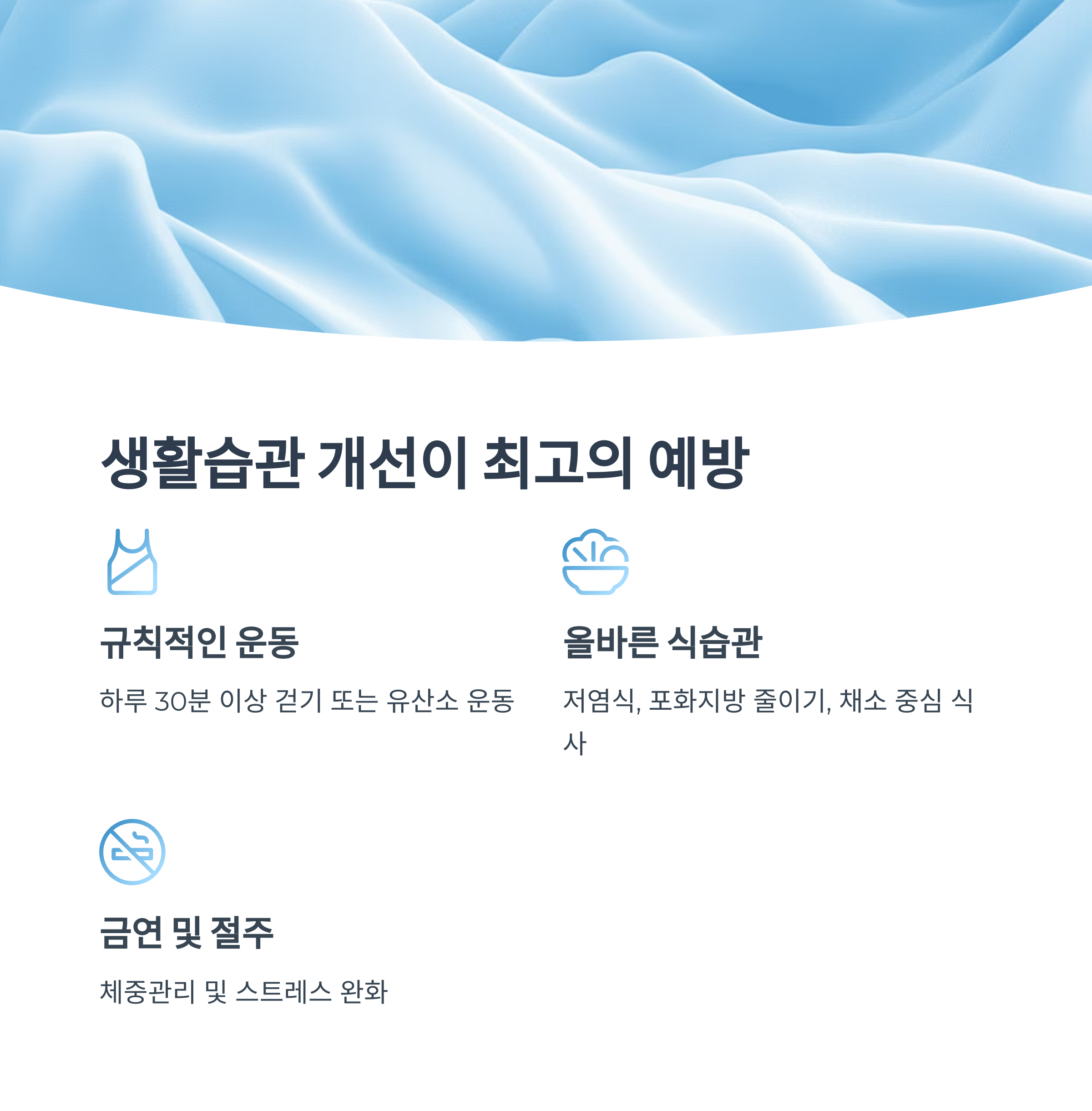 • 올바른 식습관: 저염식, 포화지방 줄이기, 채소 중심 식사