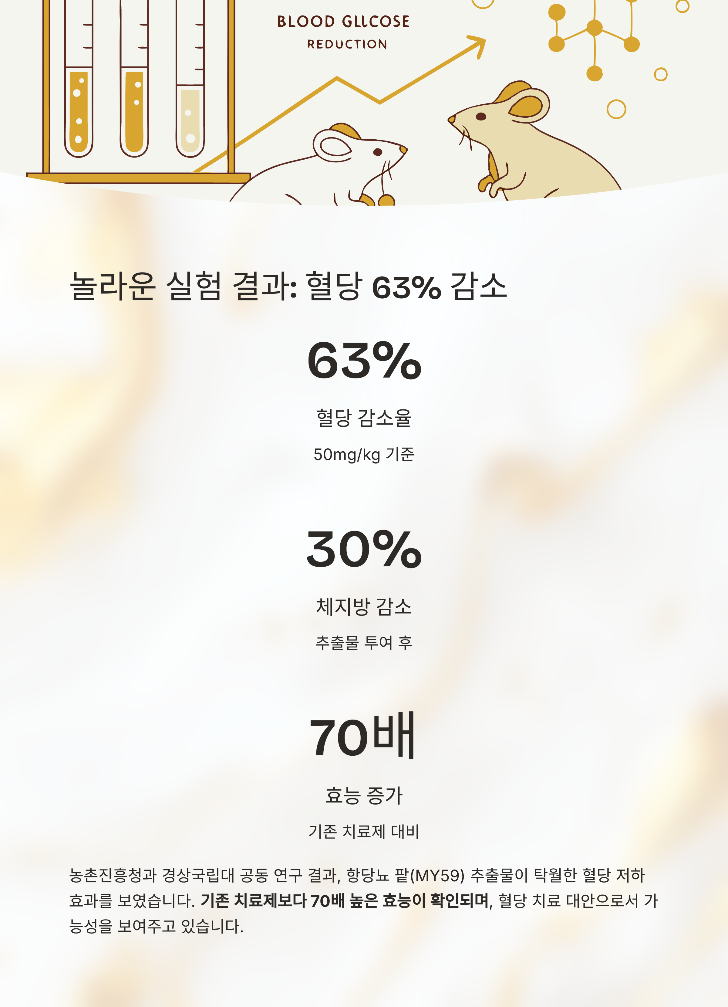 - 동물실험에서 혈당 감소율, 체지방·체중 감소 효과가 명확히 입증