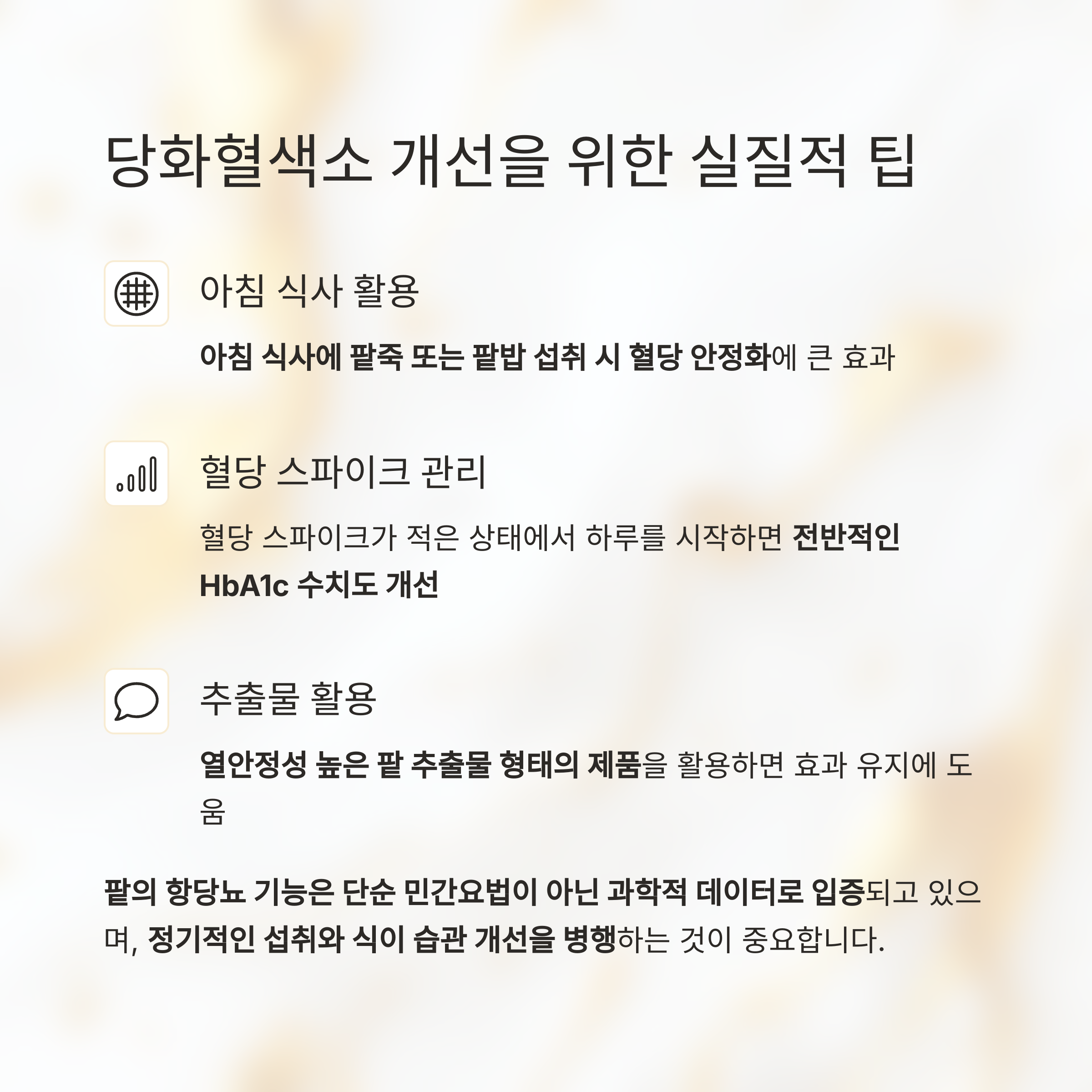 - 혈당 스파이크가 적은 상태에서 하루를 시작하면 전반적인 HbA1c 수치도 개선
