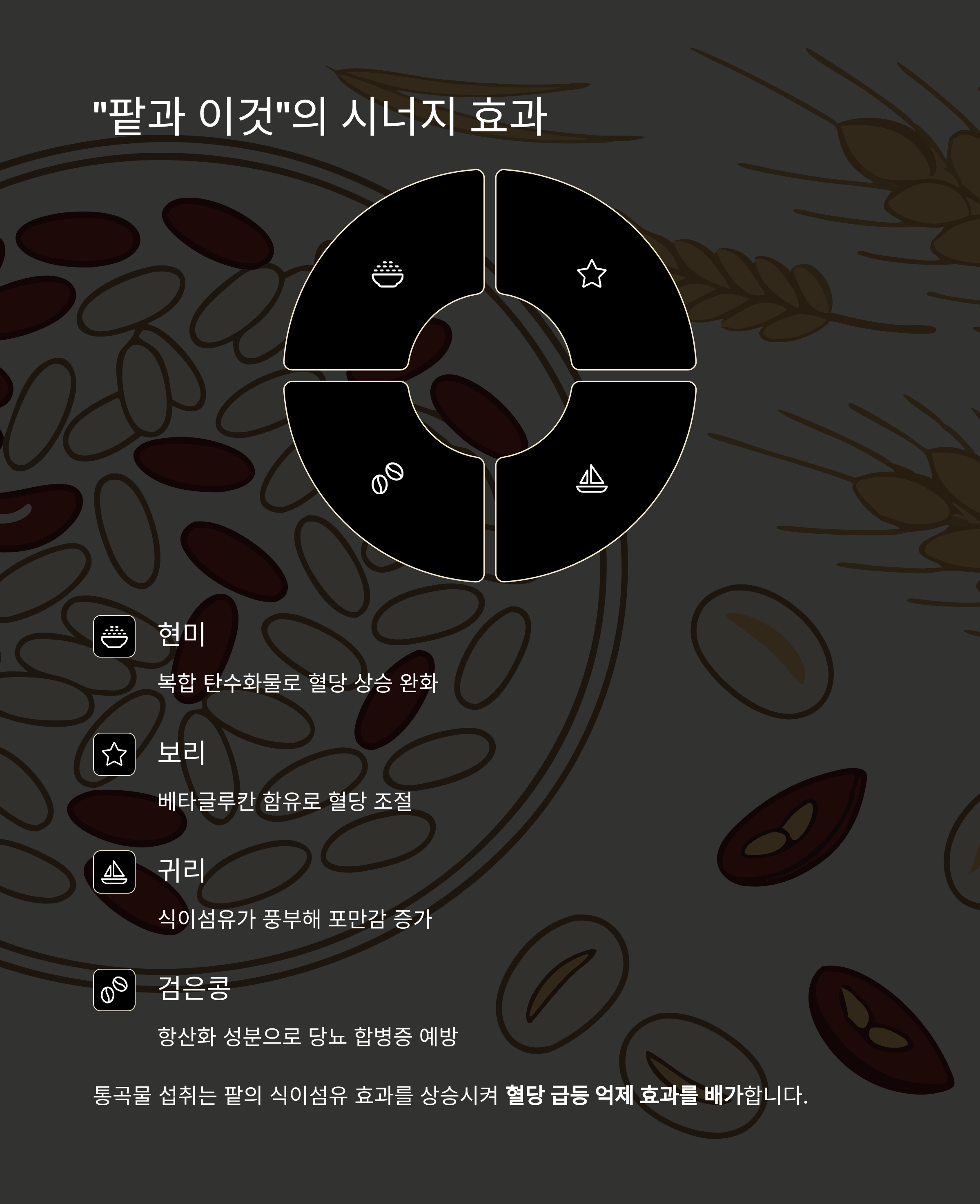 통곡물 섭취는 팥의 식이섬유 효과를 상승시켜 혈당 급등 억제 효과를 배가합니다