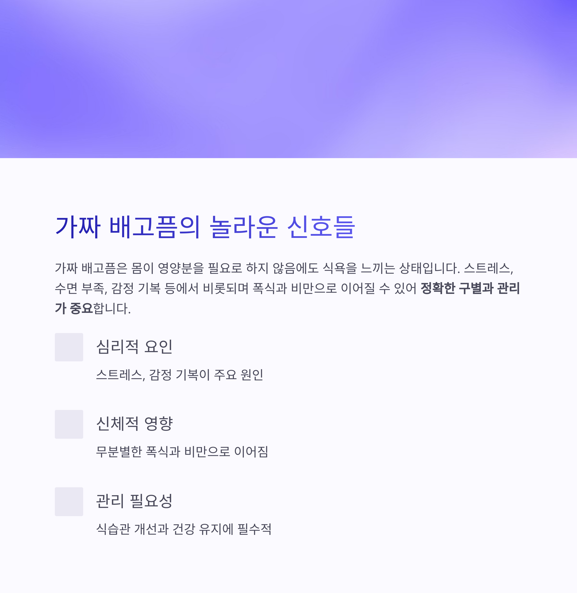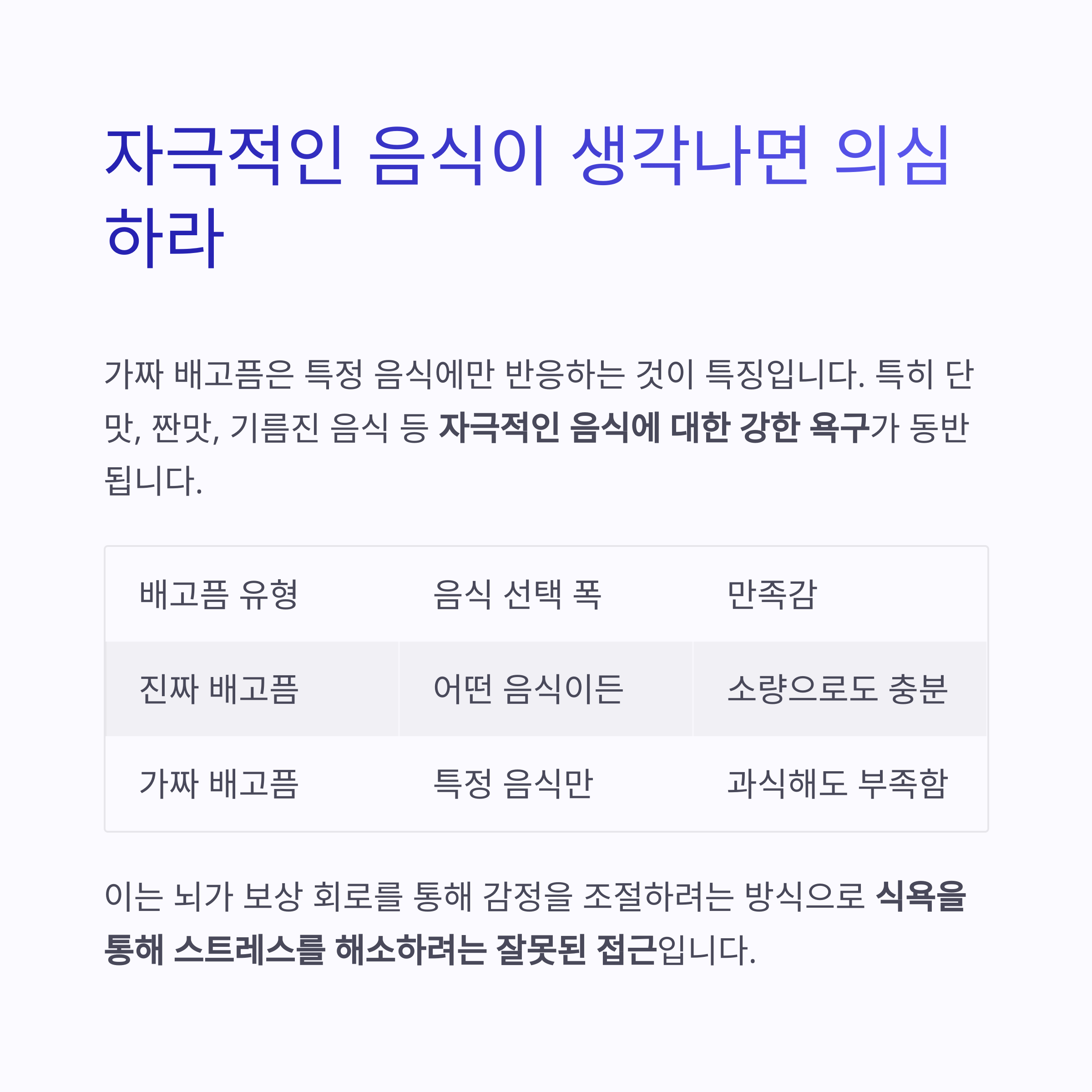 | 갑작스러운 허기 | 예고 없이 찾아오는 강한 식욕 | 신체 신호 없음 |