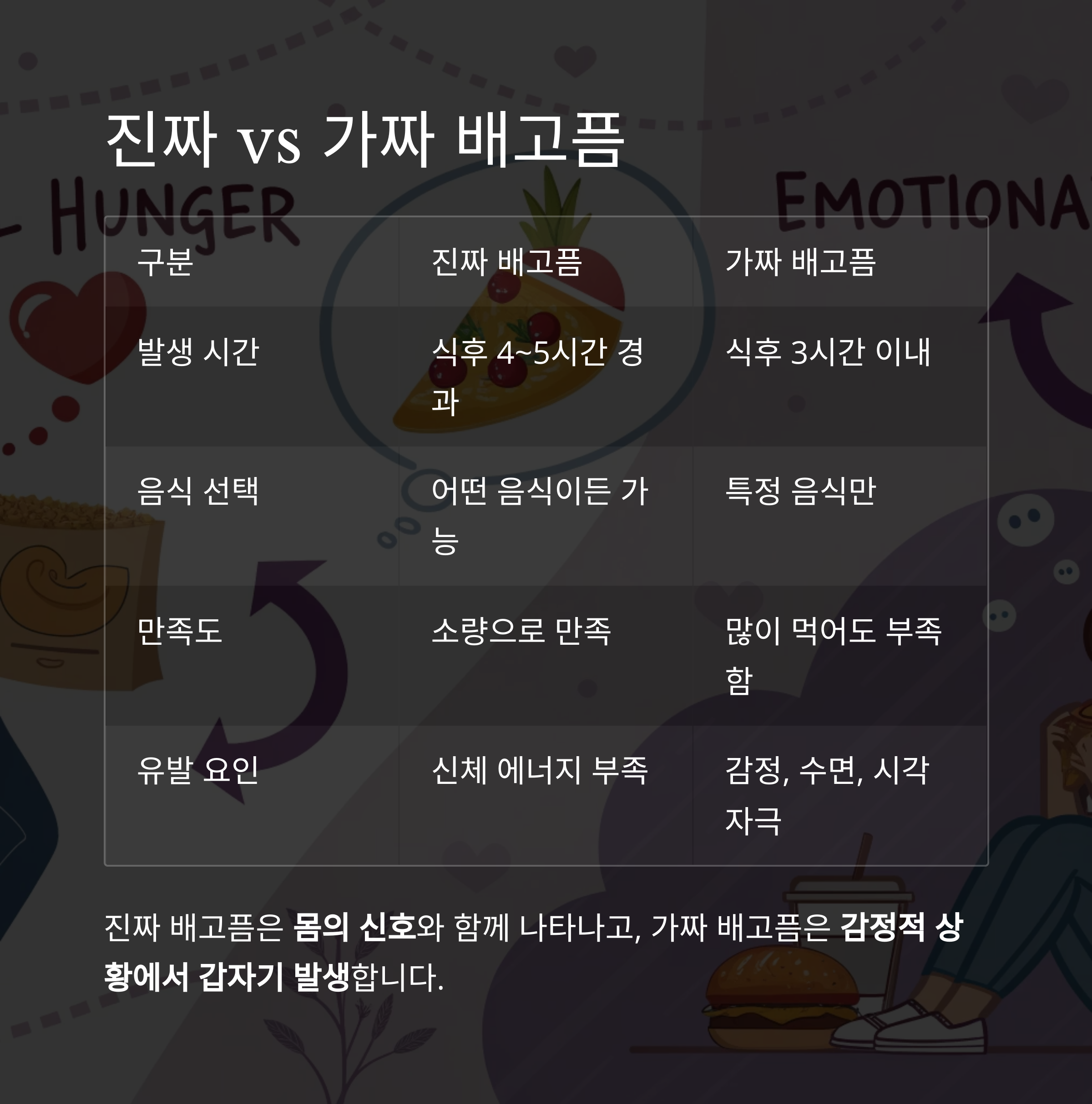 | 구분 | 진짜 배고픔 | 가짜 배고픔 |
