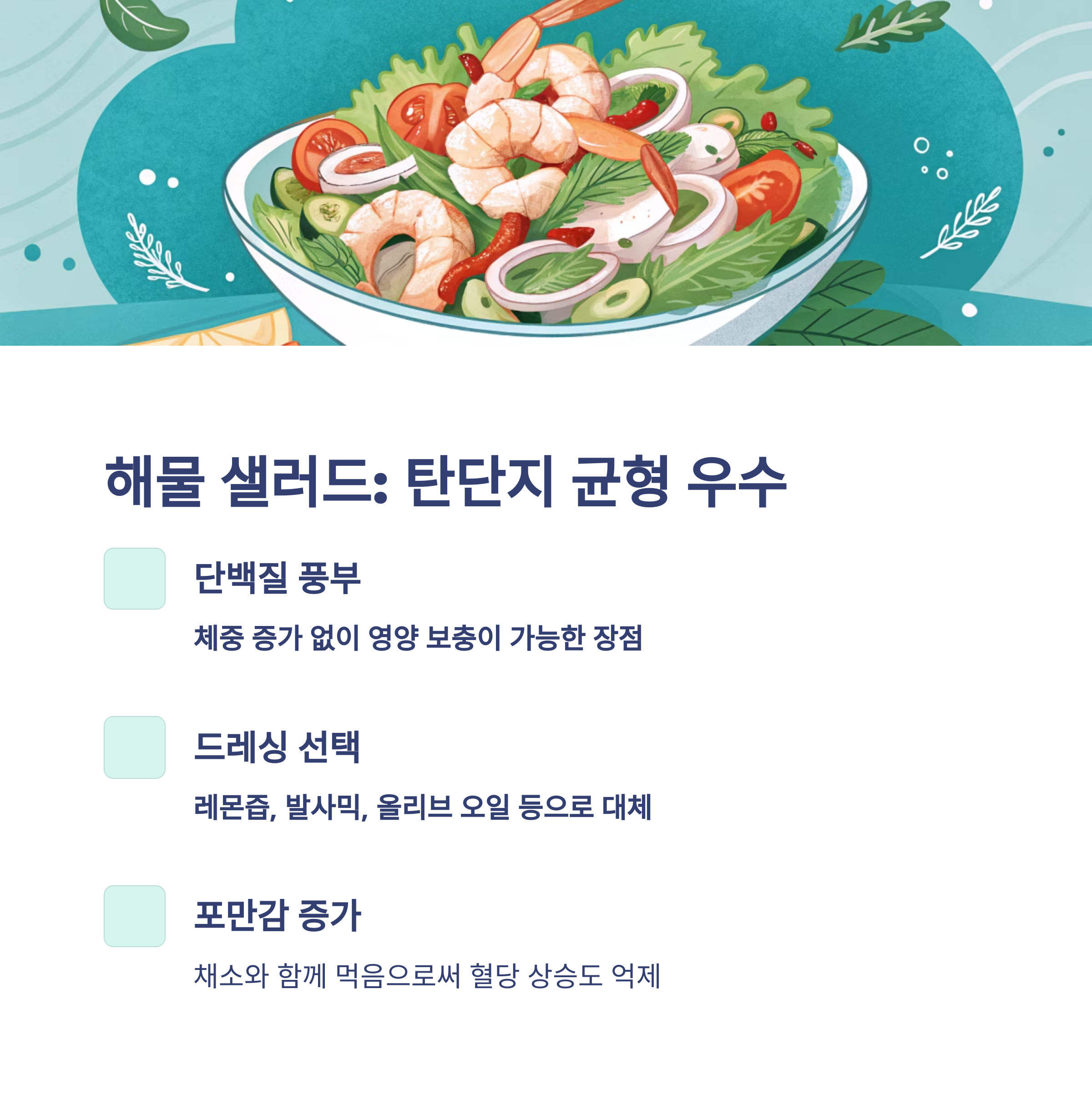 생선회, 두부, 해물 샐러드는 맛과 영양을 모두 챙길 수 있는 현명한 선택입니다