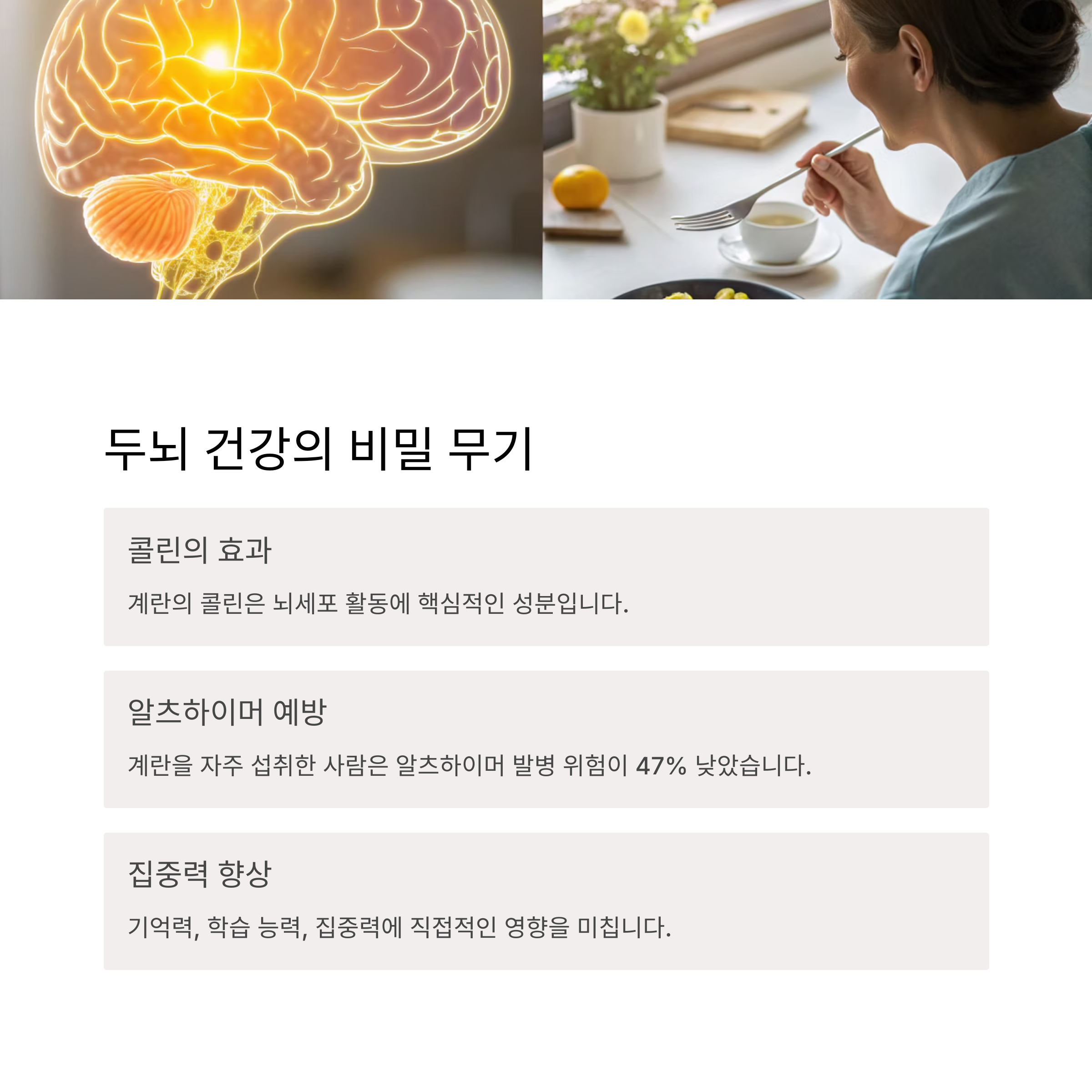 "계란을 자주 섭취한 사람은 알츠하이머 발병 위험이 47% 낮았다"는 결과가 있습니다