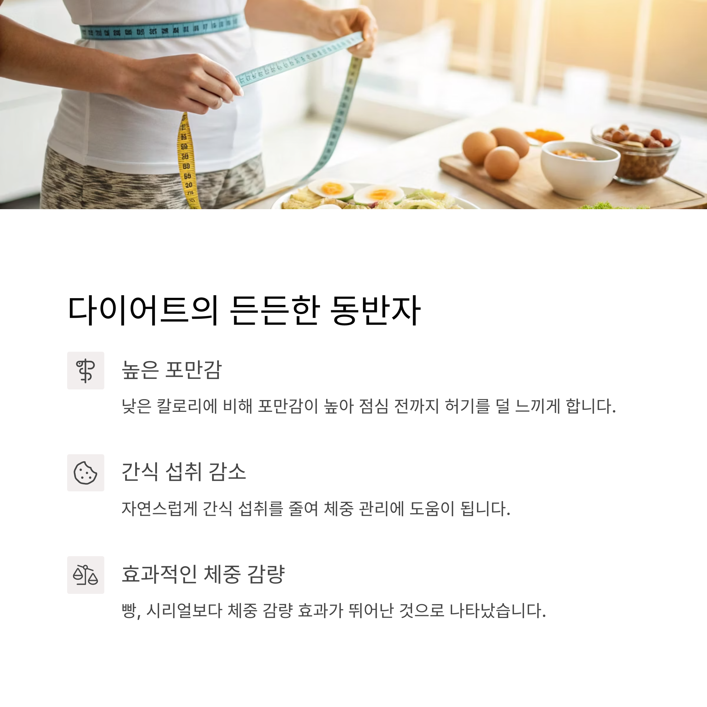"점심 전까지 허기를 덜 느끼게 하여 자연스럽게 간식 섭취를 줄여줍니다"