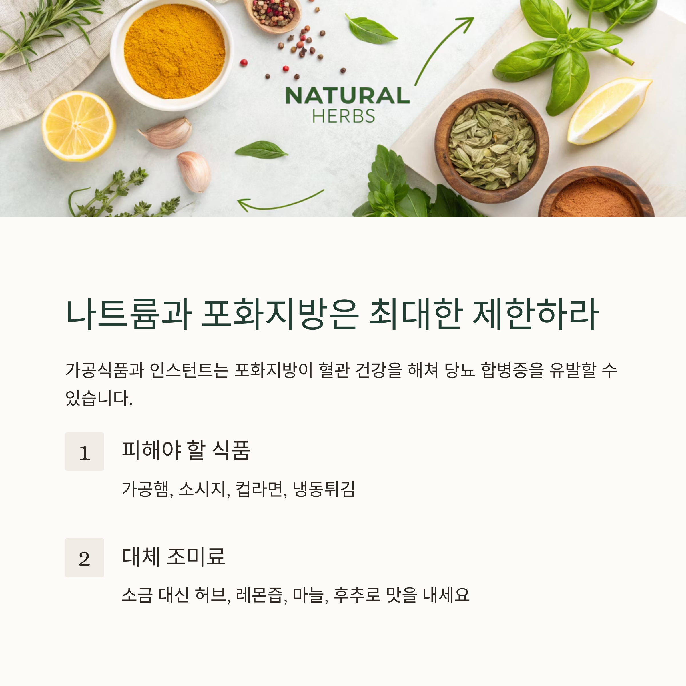 - 소금 대신 허브, 레몬즙, 마늘, 후추 등으로 맛을 내면 건강한 풍미를 더할 수 있습니다