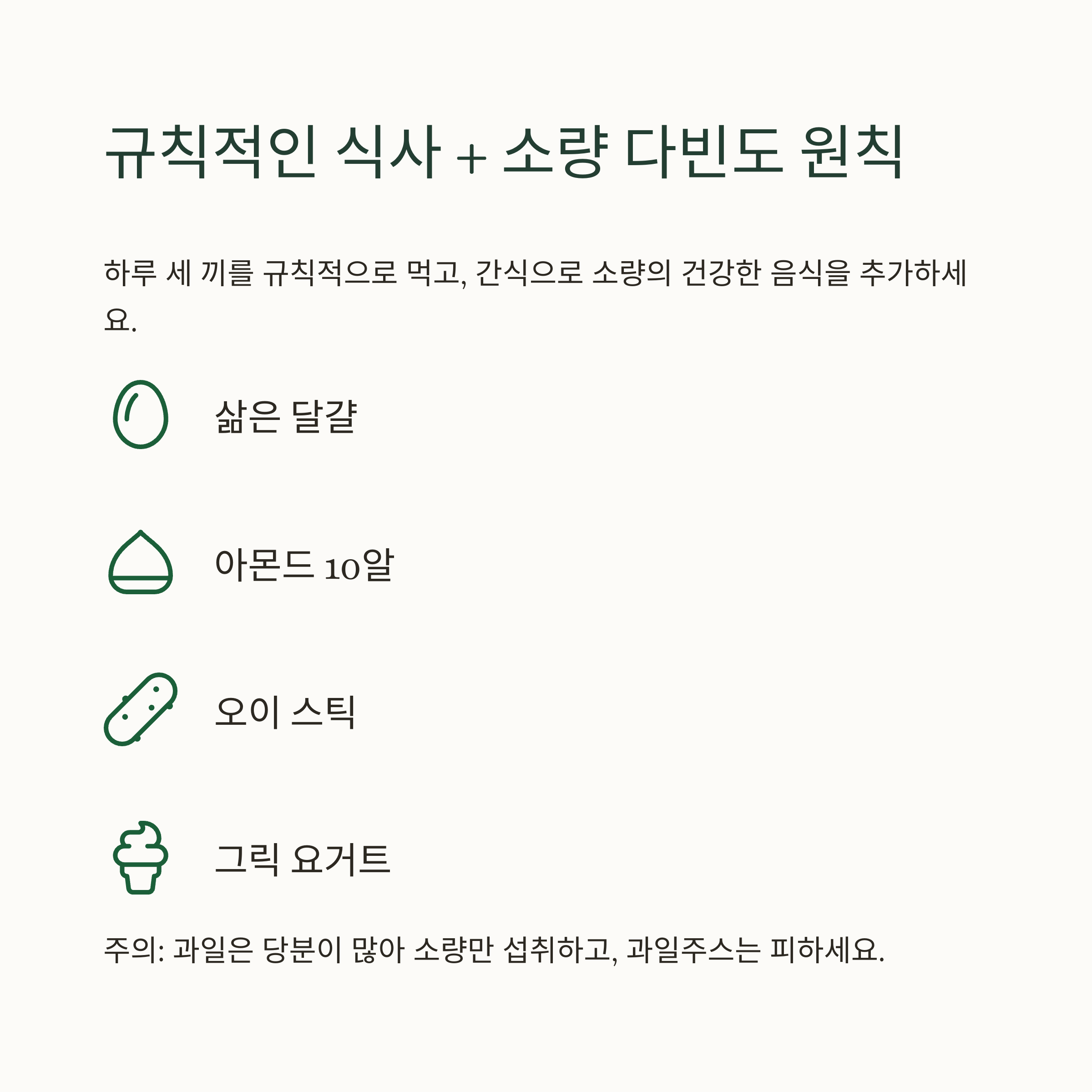 - 추천 간식: 삶은 달걀, 아몬드 10알, 오이 스틱, 그릭 요거트, 미니 토마토