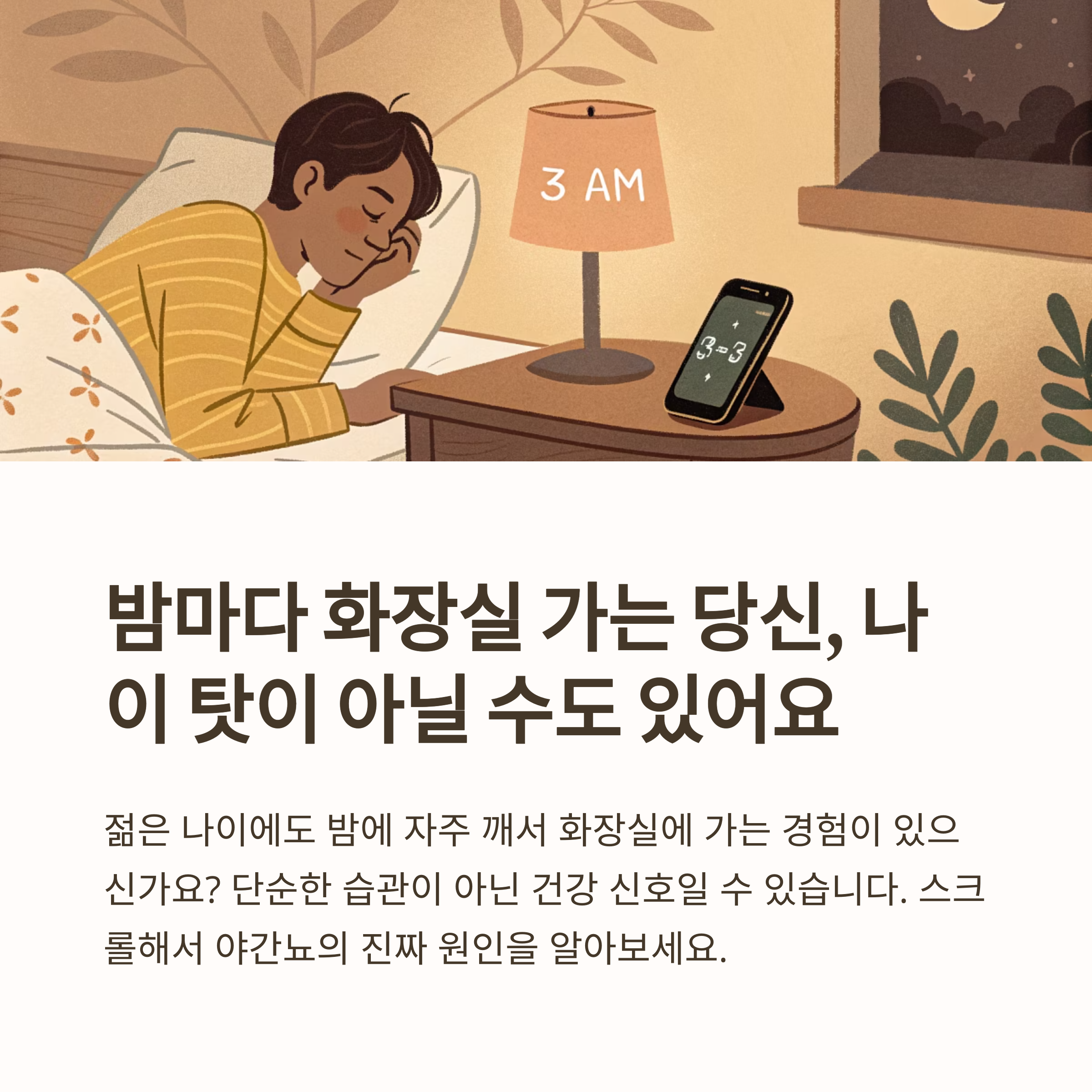 야간뇨는 단순히 물을 많이 마셔서 생기는 일시적 증상이 아니다. 특히 젊은 층에서도 충분히 발생할 수 있으며, 방치하면 만성 수면 부족, 낮 시간대 피로, 삶의 질 저하 등 다양한 문제를 초래할 수 있다. 야간에 자주 깬다면, 반드시 배뇨일지를 작성하고 전문의의 진료를 받아보는 것이 가장 현명한 방법이다. 하루라도 빨리 원인을 파악하고 생활 습관과 식이 요법을 병행하면, 건강한 수면을 되찾을 수 있다.