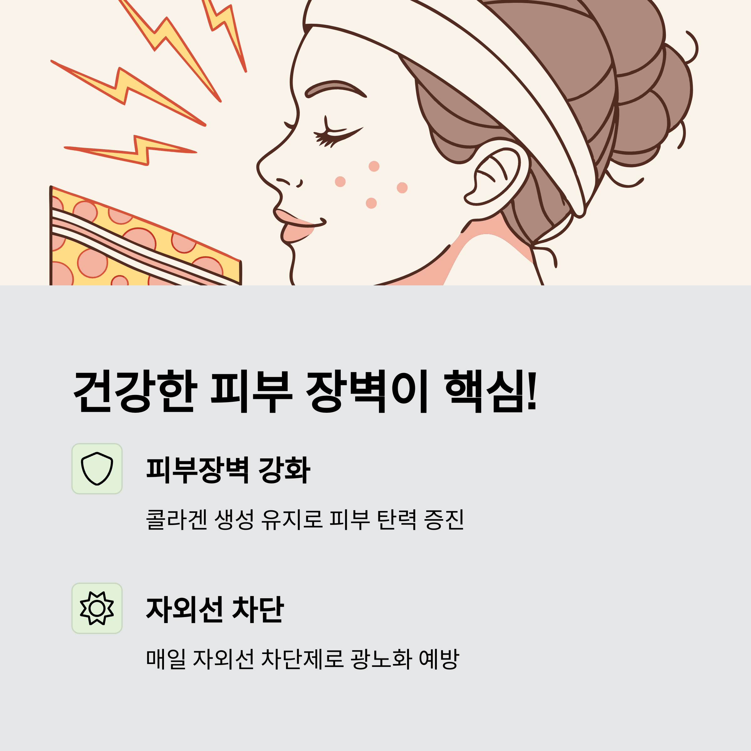 | 건강한 장벽이 피부 노화 방지의 핵심 역할 | 선크림은 매일, 계절 불문 필수 | 비타민 풍부 식단이 노화 속도 감소 |