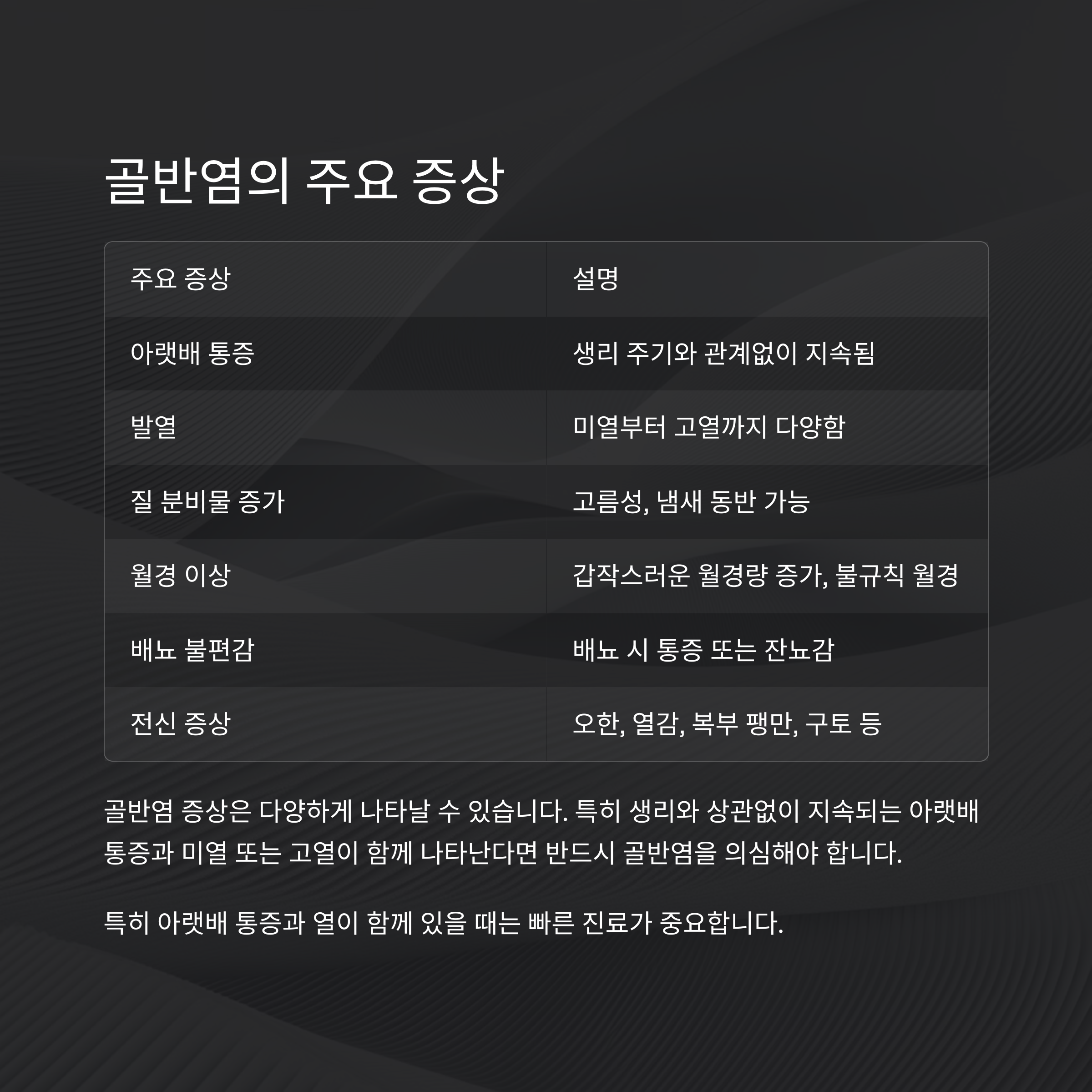 골반염의 주요 증상은 어떤 것이 있나요?