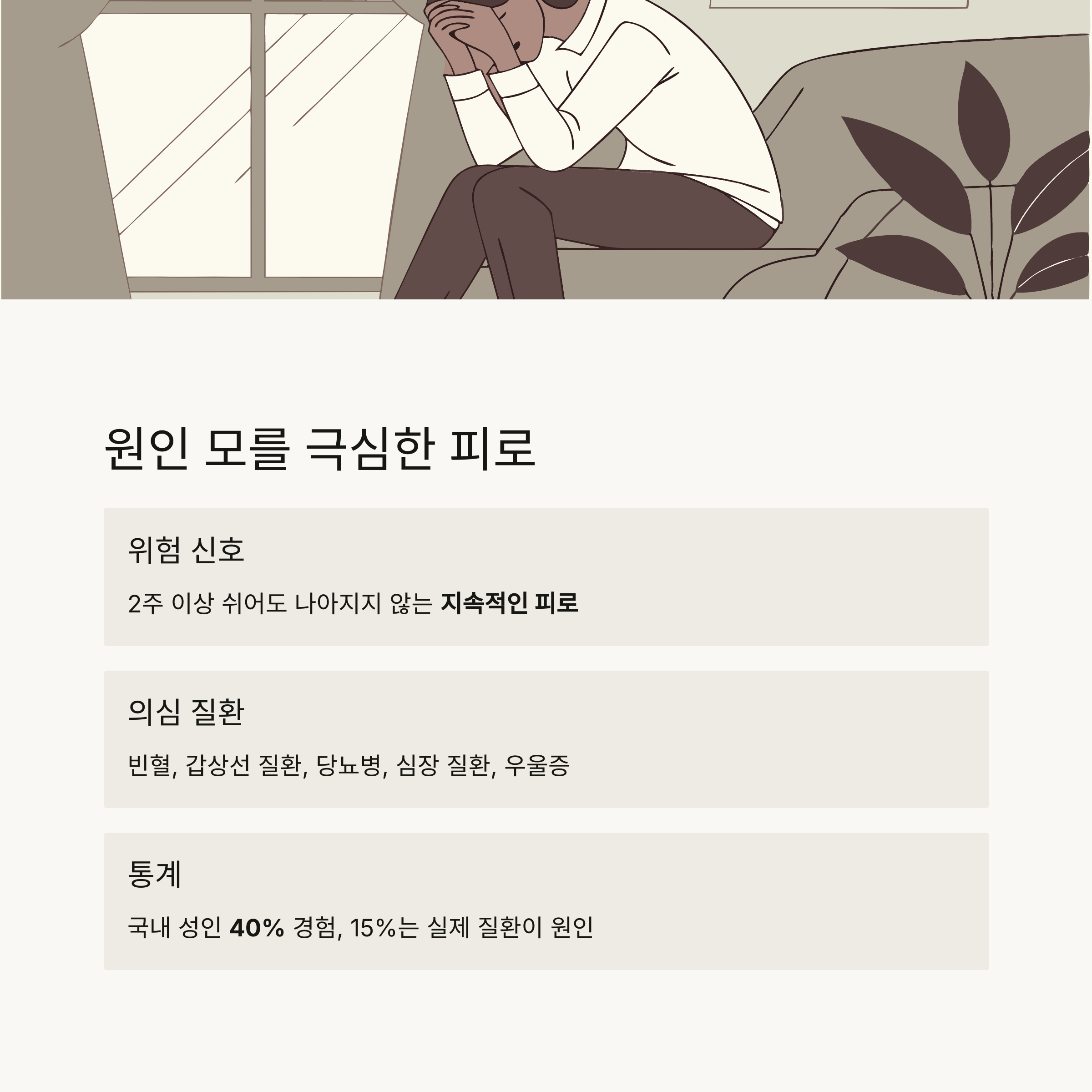 극심한 피로 빈혈, 갑상선, 당뇨, 심장 2주 이상 지속 성인 40% 경험, 15% 질병 원인