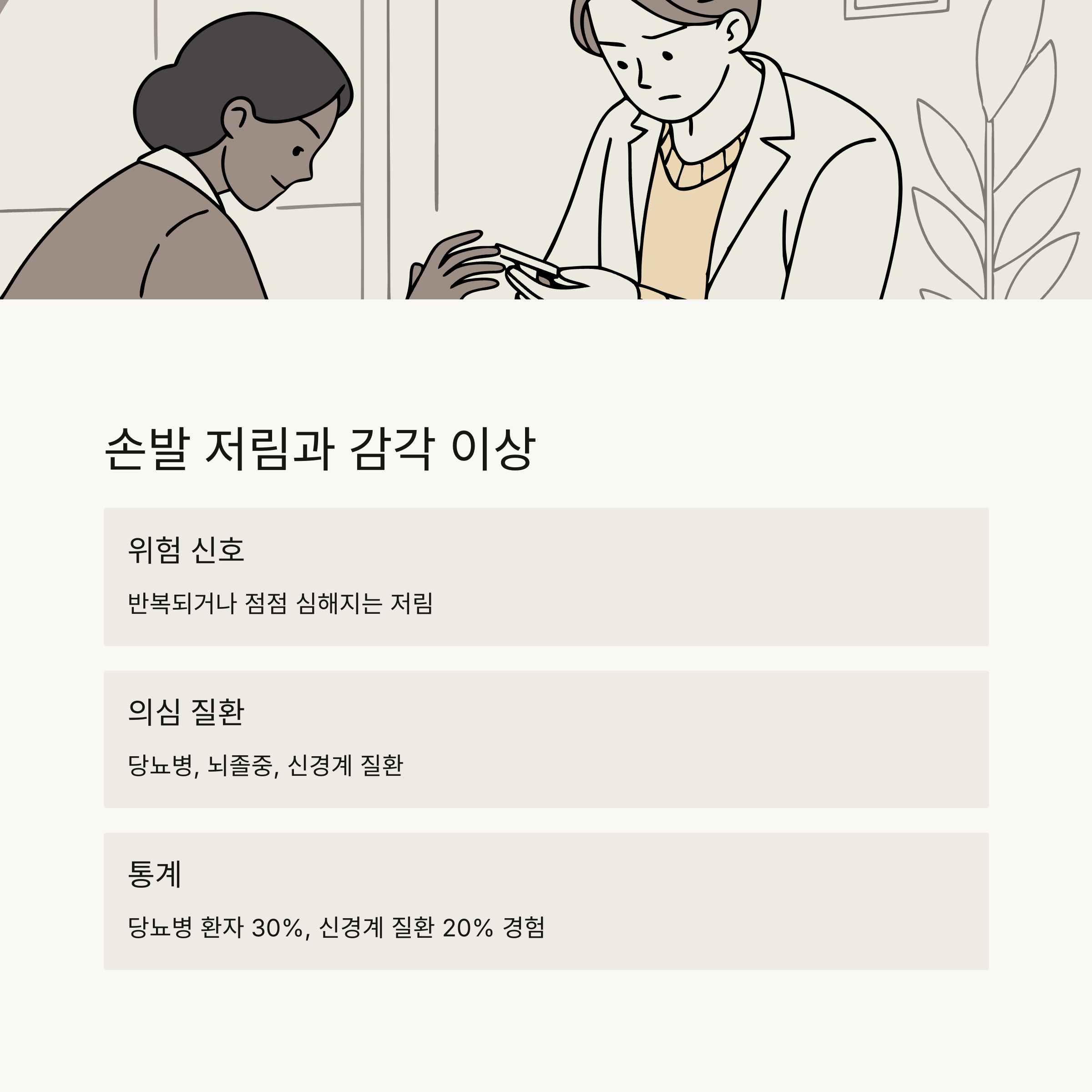 손발 저림/감각이상 당뇨, 신경계, 뇌졸중 반복·점진적 저림, 감각이상 당뇨병 30%, 신경계 20% 경험