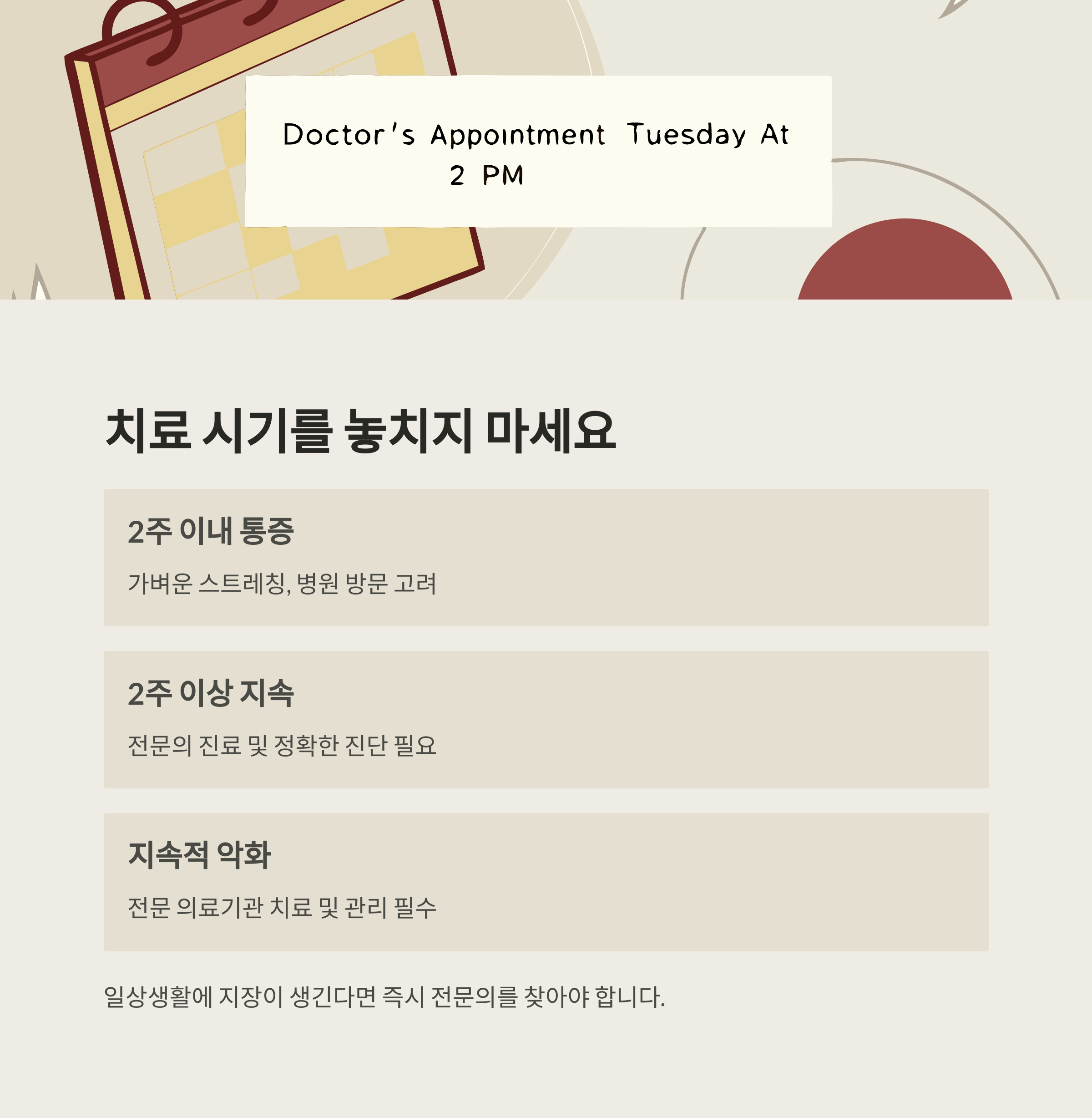 | 2주 이내 | 가벼운 스트레칭, 병원 방문 고려 |