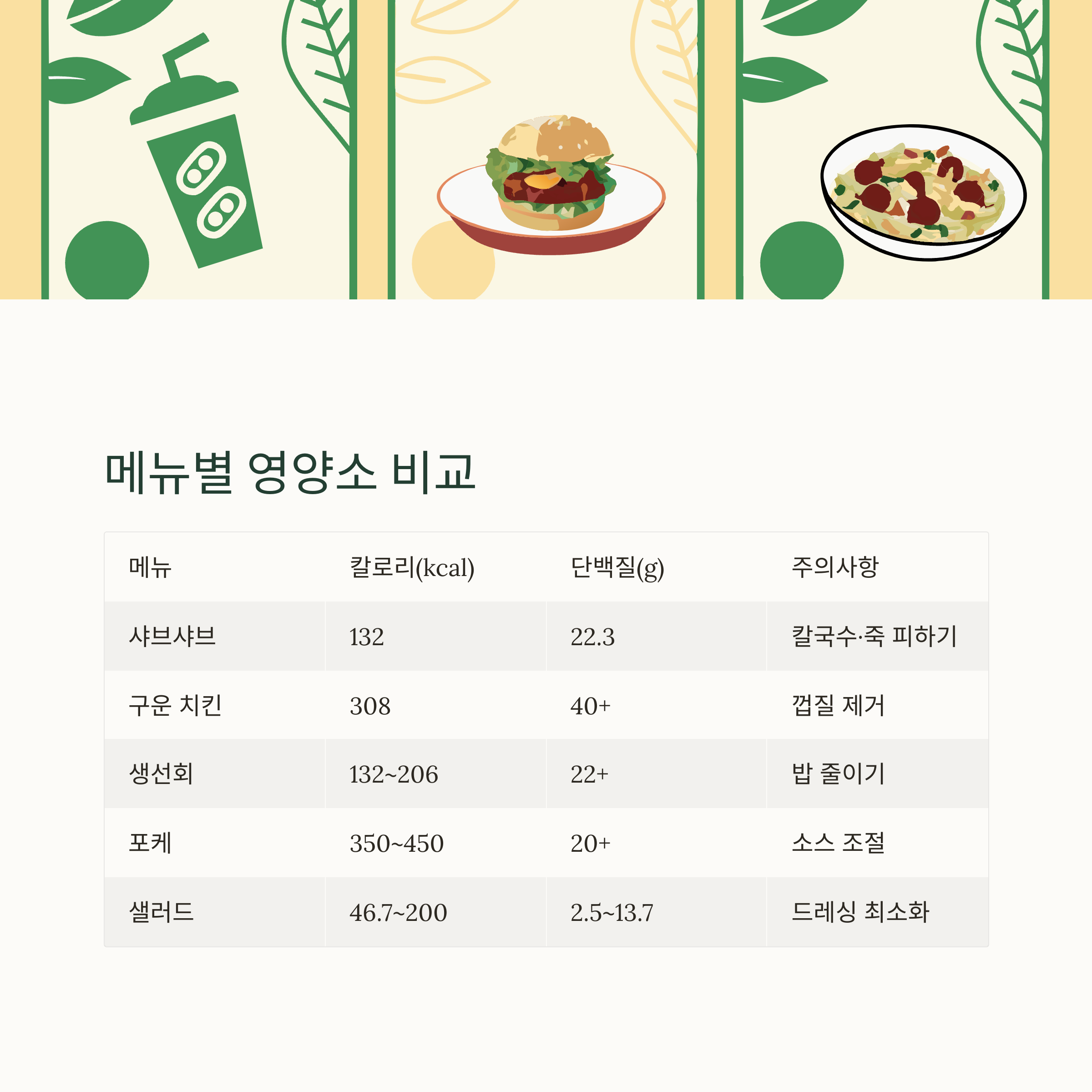 | 메뉴 | 1회 제공량 | 칼로리(kcal) | 단백질(g) | 특징/주의사항 |