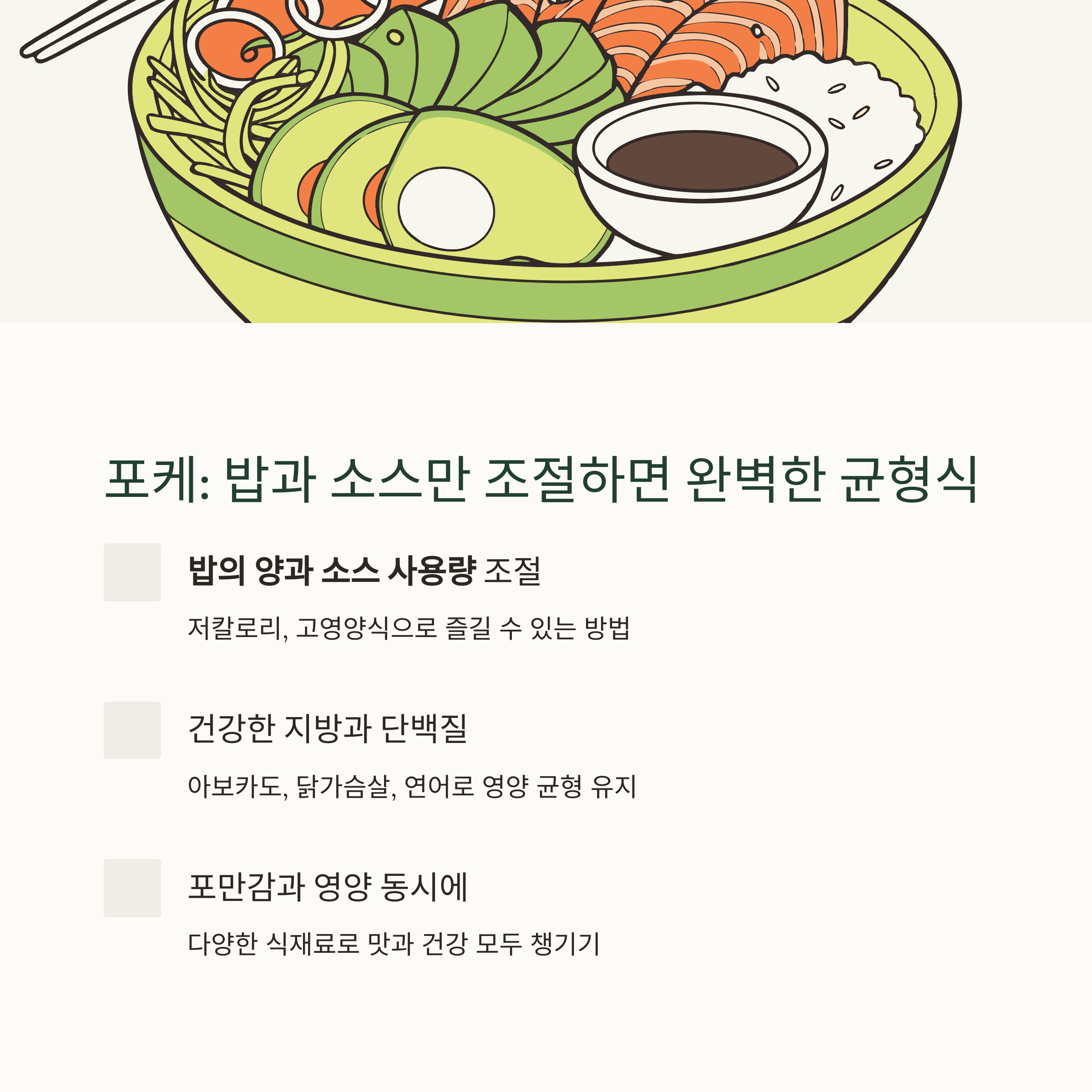 | 포케 | 1그릇 | 350~450 | 20 이상 | 밥·소스 양 조절, 채소·단백질 위주 |