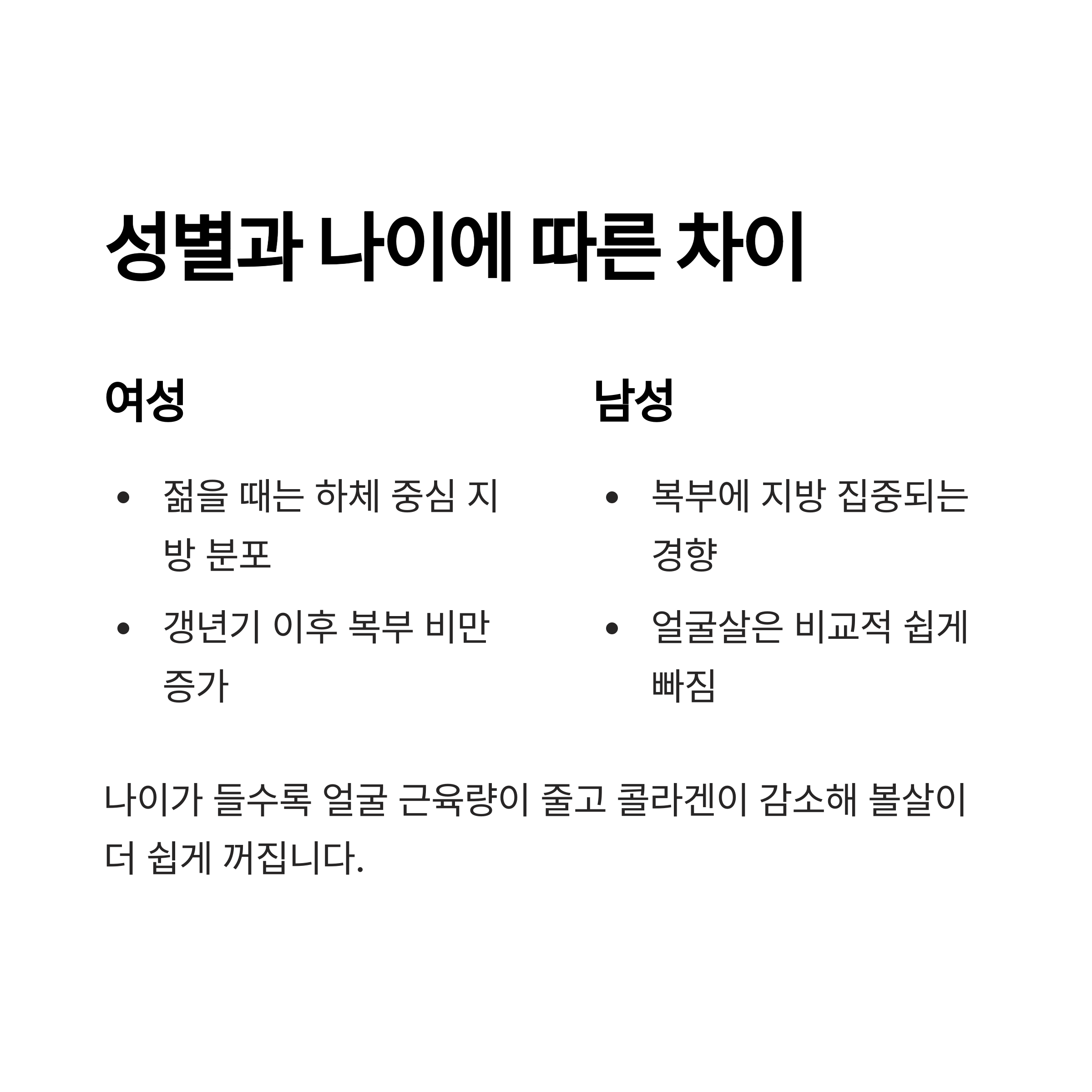 | 4 | 근육량 적음 | 노화로 인한 피부 탄력 저하 |