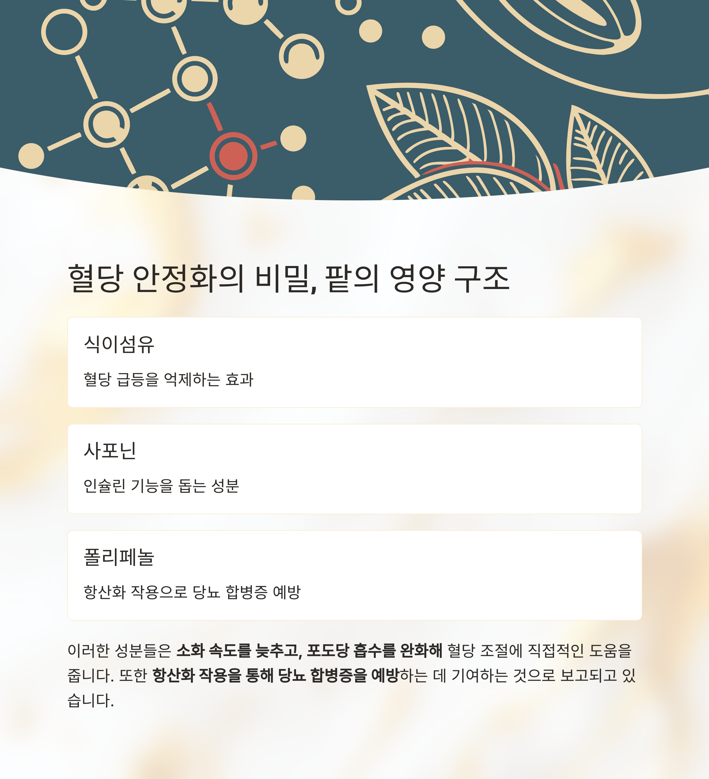 이러한 성분들은 소화 속도를 늦추고, 포도당 흡수를 완화해 혈당 조절에 직접적인 도움을 줍니다