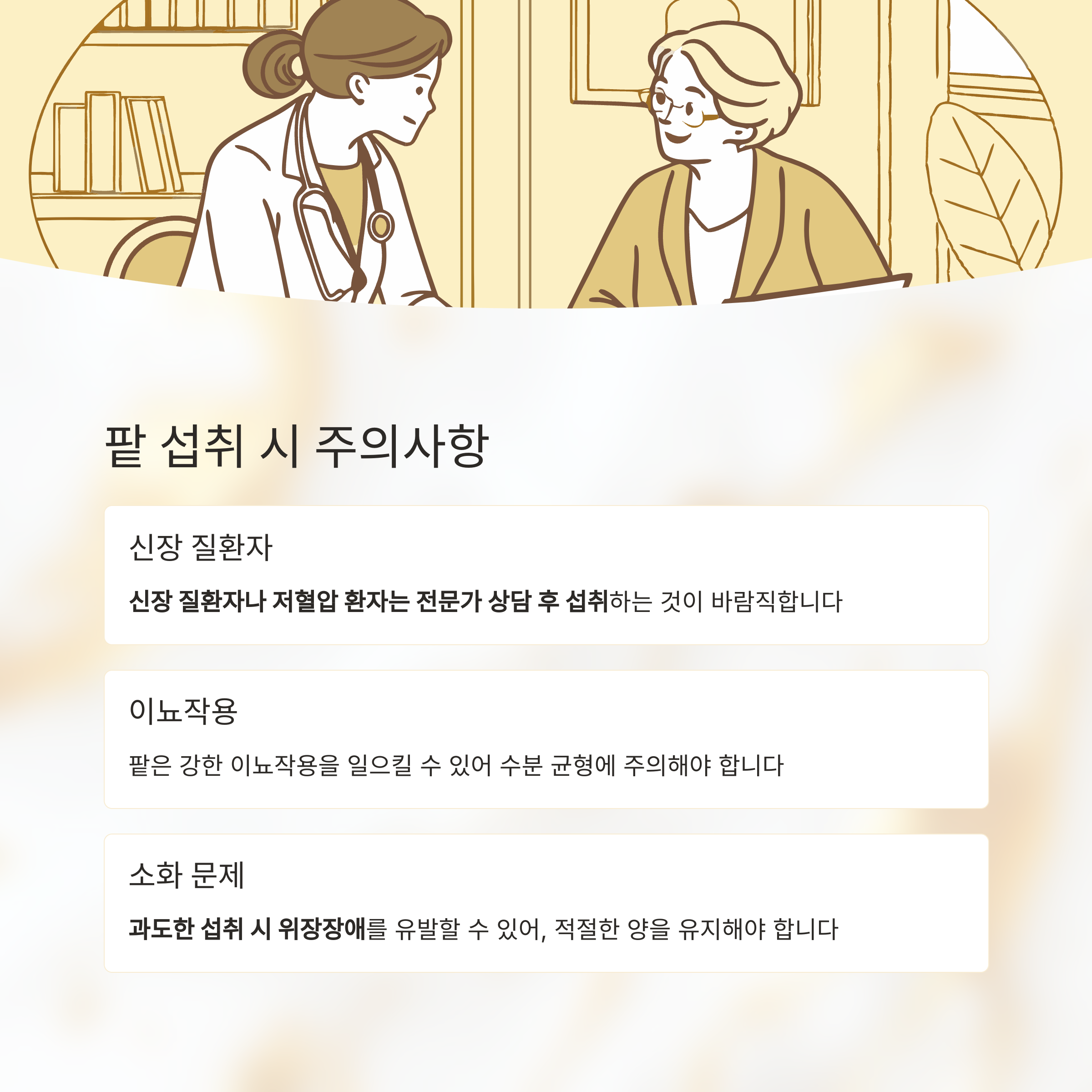 신장 질환자나 저혈압 환자는 전문가 상담 후 섭취하는 것이 바람직합니다