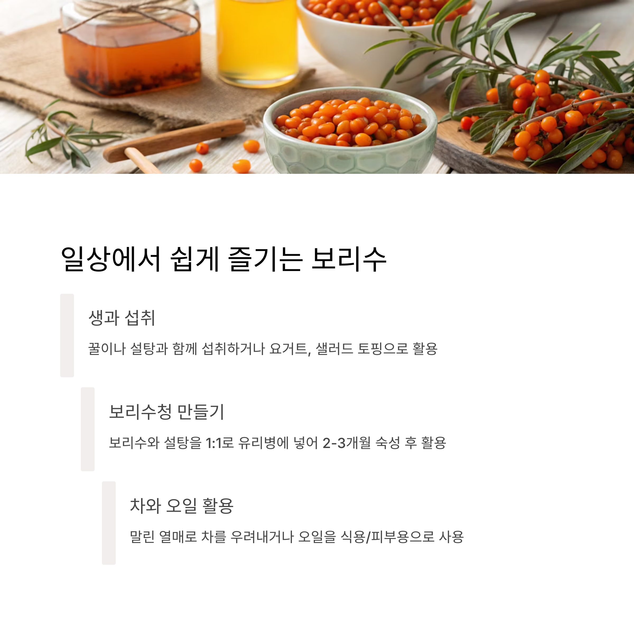 잼이나 주스로 가공해 빵, 디저트, 음료에 다양하게 활용할 수 있습니다. - 보리수 오일