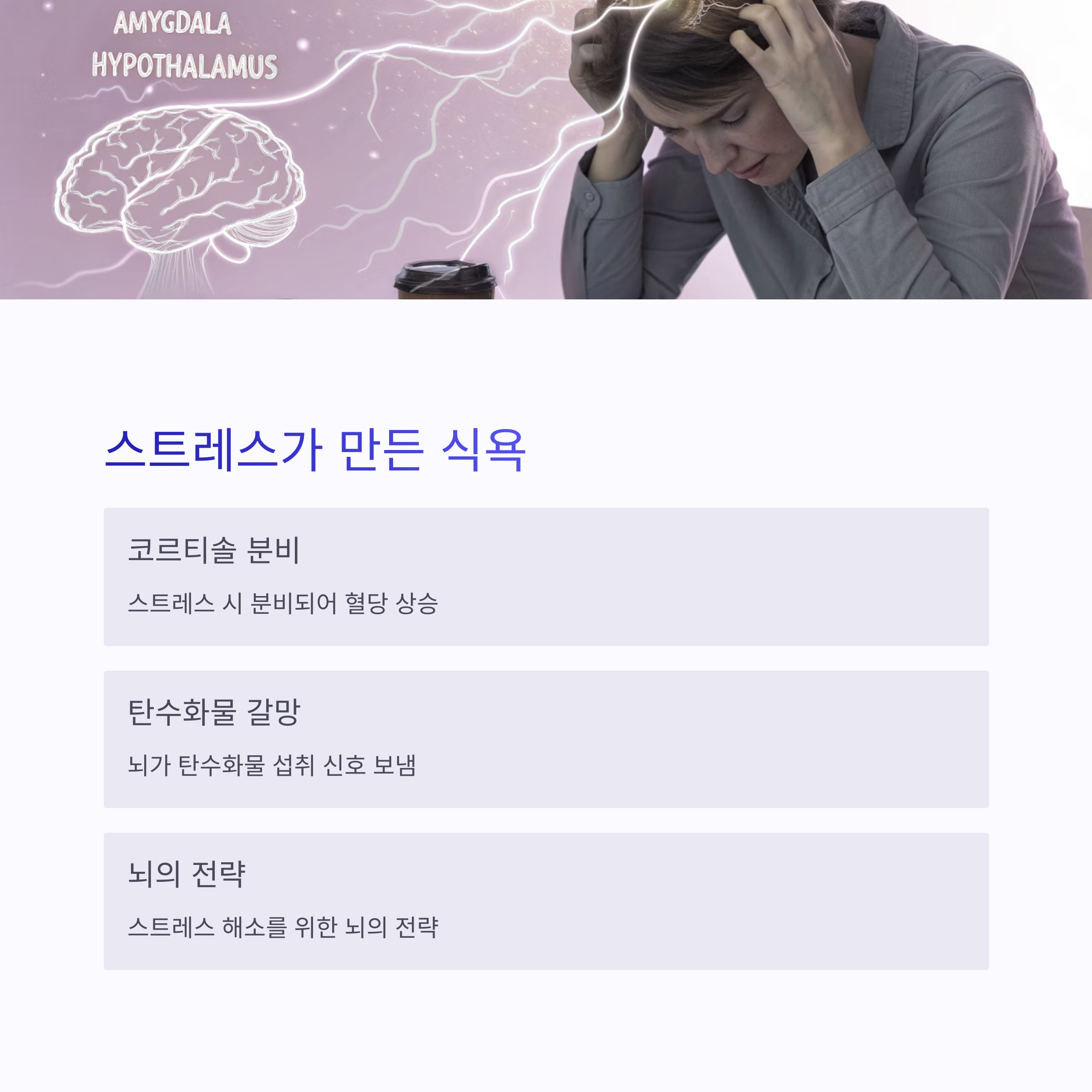 | 특정 음식에 대한 갈망 | 초콜릿, 떡볶이 등 자극적인 음식 | 스트레스 상황과 연관 |