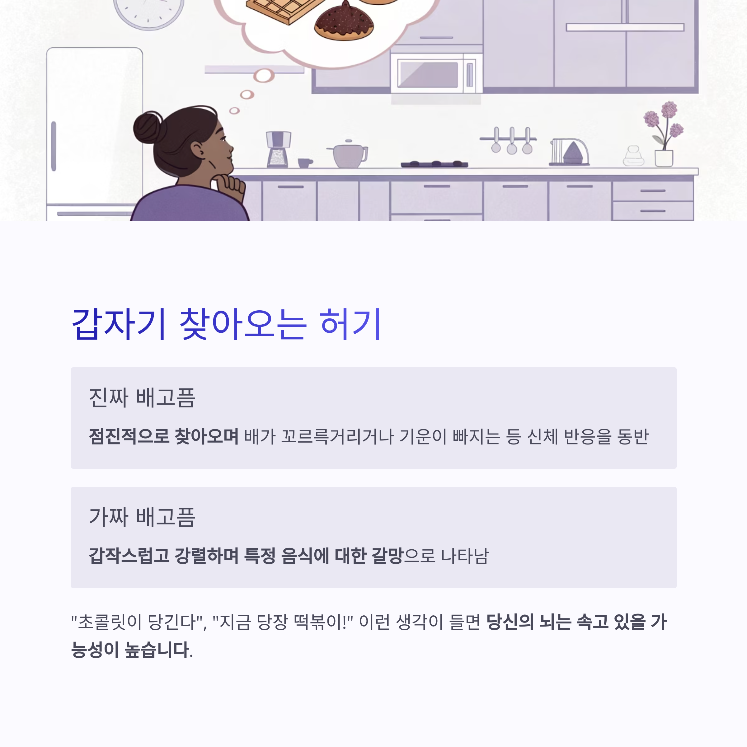 | 갑작스러운 허기 | 예고 없이 찾아오는 강한 식욕 | 신체 신호 없음 |