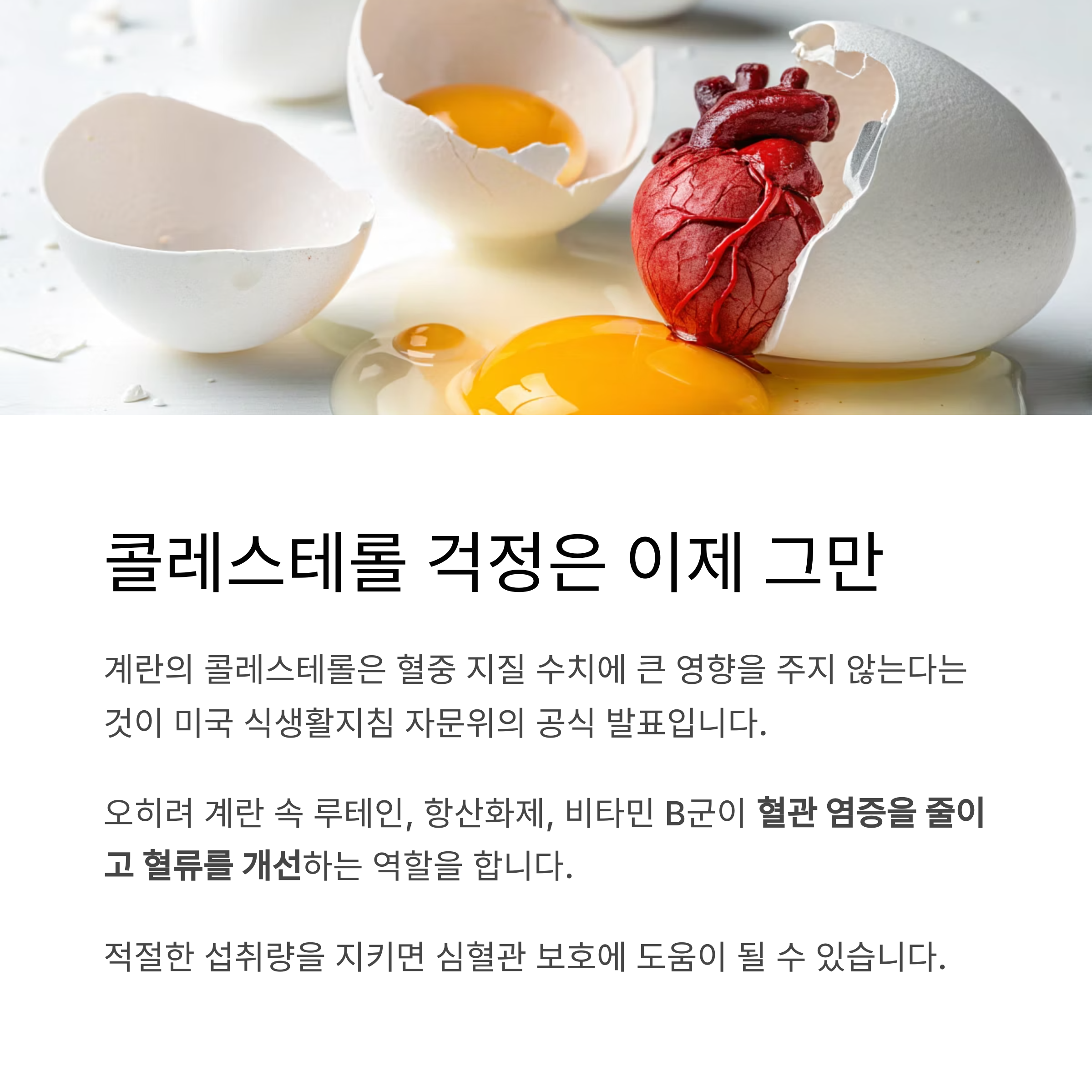 오히려 계란 속 루테인, 항산화제, 비타민 B군이 혈관 염증을 줄이고 혈류를 개선하는 역할을 합니다