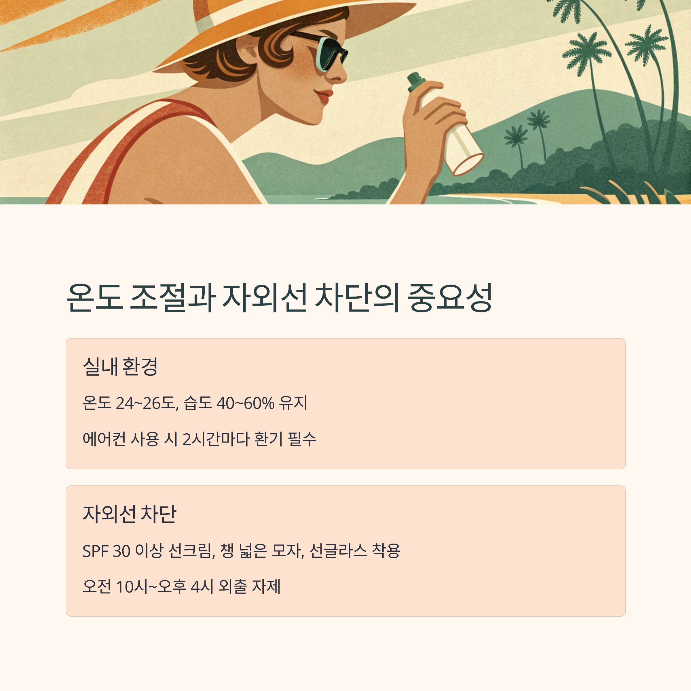 실내외 온도 관리와 자외선 차단이 매우 중요합니다.