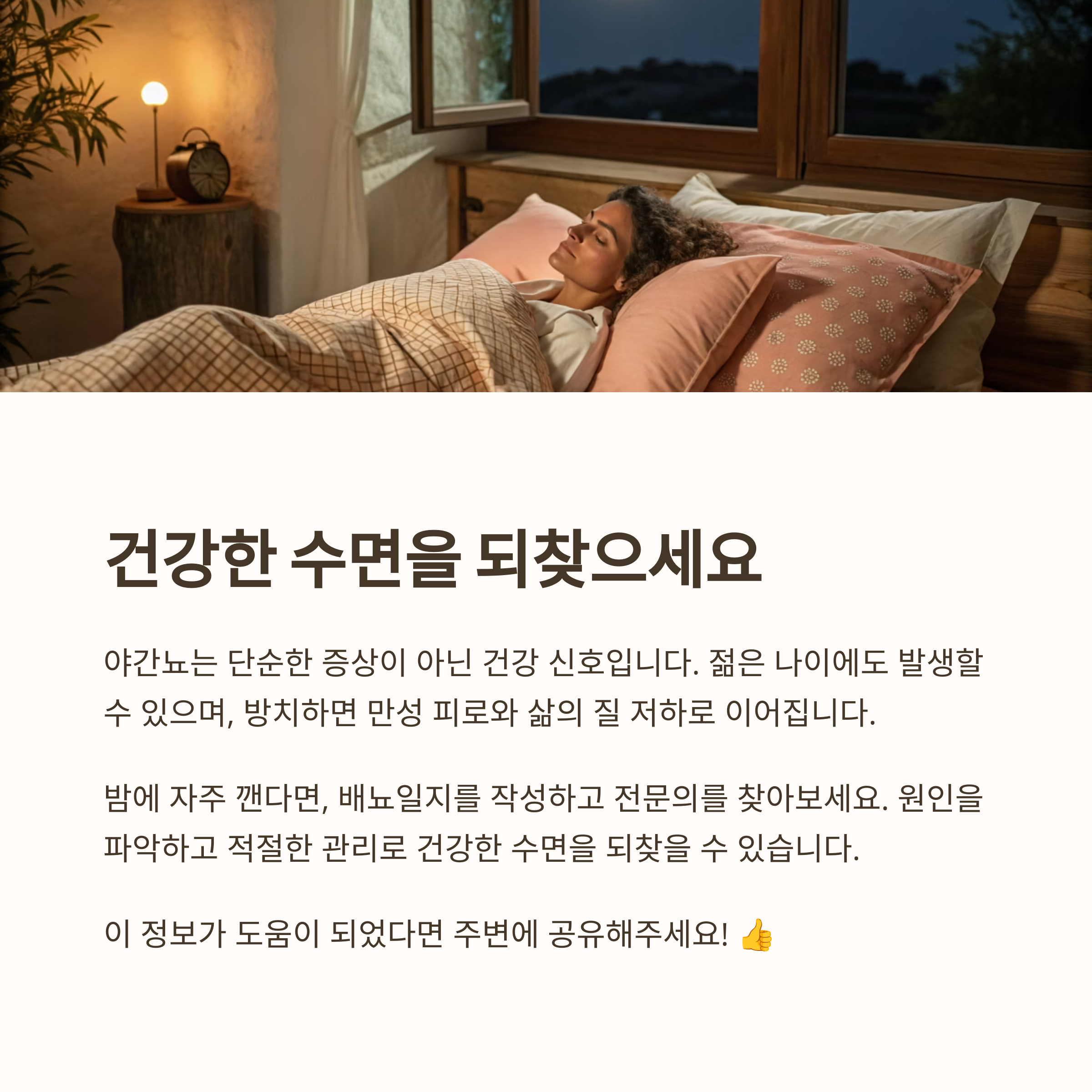 야간뇨는 단순히 물을 많이 마셔서 생기는 일시적 증상이 아니다. 특히 젊은 층에서도 충분히 발생할 수 있으며, 방치하면 만성 수면 부족, 낮 시간대 피로, 삶의 질 저하 등 다양한 문제를 초래할 수 있다. 야간에 자주 깬다면, 반드시 배뇨일지를 작성하고 전문의의 진료를 받아보는 것이 가장 현명한 방법이다. 하루라도 빨리 원인을 파악하고 생활 습관과 식이 요법을 병행하면, 건강한 수면을 되찾을 수 있다.