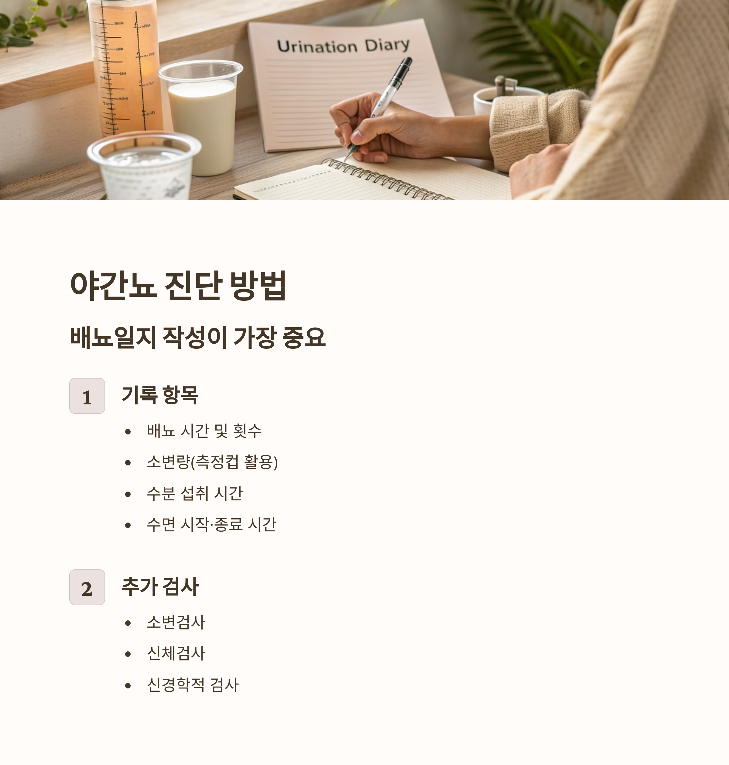 정확한 진단을 위해 가장 기본이 되는 것은 배뇨일지 작성이다. 최소 3일 이상 기록해야 하며, 아래와 같은 정보를 포함해야 한다: