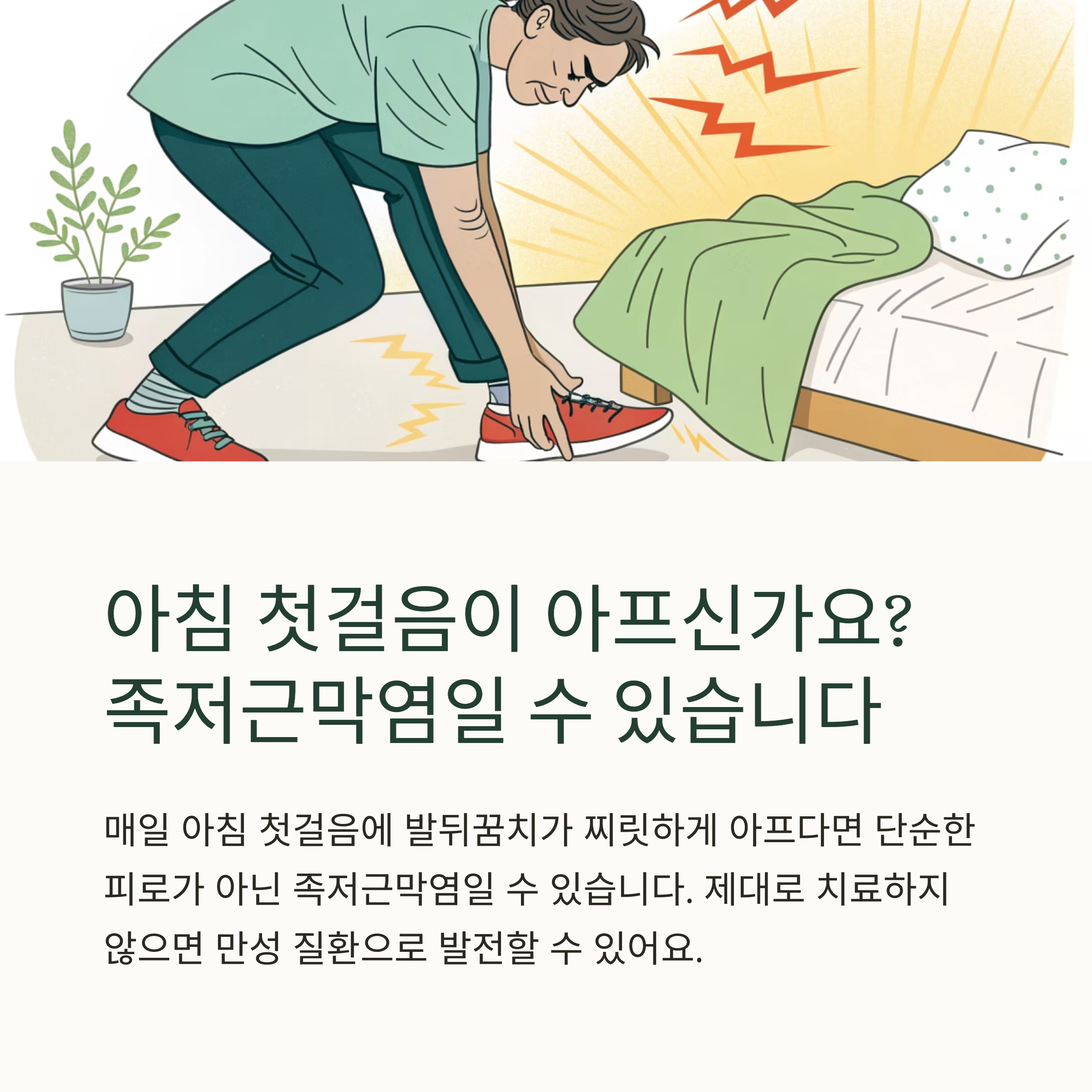 아침에 첫걸음을 내딛는 순간 발뒤꿈치에 날카로운 통증이 느껴진다면, 이는 단순한 피로가 아닌 족저근막염의 초기 신호일 수 있습니다. 40대 이상 중장년층은 물론, 오래 서서 일하는 직업을 가진 사람들에게도 빈번히 발생하는 이 질환은 조기 치료와 생활습관 개선으로 충분히 호전될 수 있습니다. 하루의 시작을 통증 없이 시작하고 싶다면, 지금부터 발 건강에 집중해보세요.