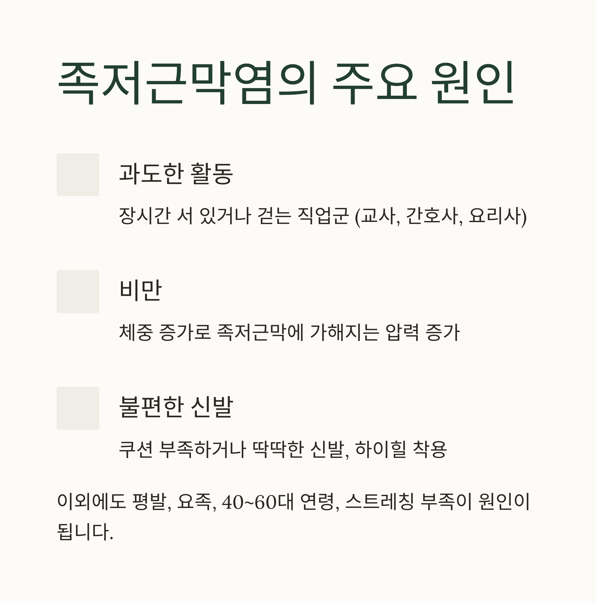족저근막에 무리가 가는 생활습관이나 구조적 문제로 인해 염증이 유발됩니다. 아래 요인들이 복합적으로 작용해 발병 위험을 높입니다.