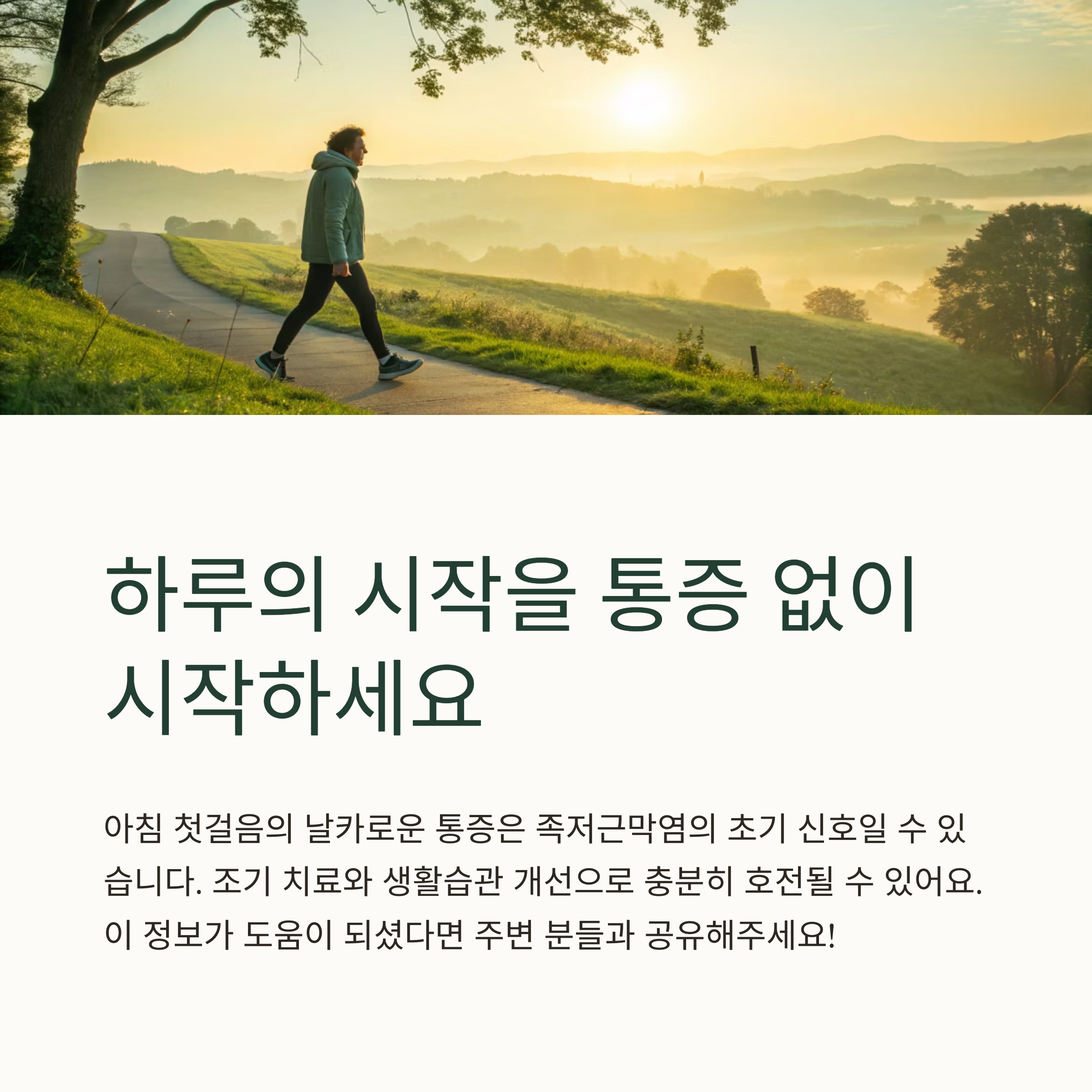 정형외과 전문의들은 “아침 첫 발에 통증이 반복된다면 절대 방치해서는 안 되며, 조기에 적절한 치료와 생활습관 개선이 이뤄진다면 대부분의 환자가 수개월 내 증상 개선을 경험한다”고 강조합니다. 특히 스트레칭과 휴식은 약물보다 더 중요한 관리법이 될 수 있습니다.