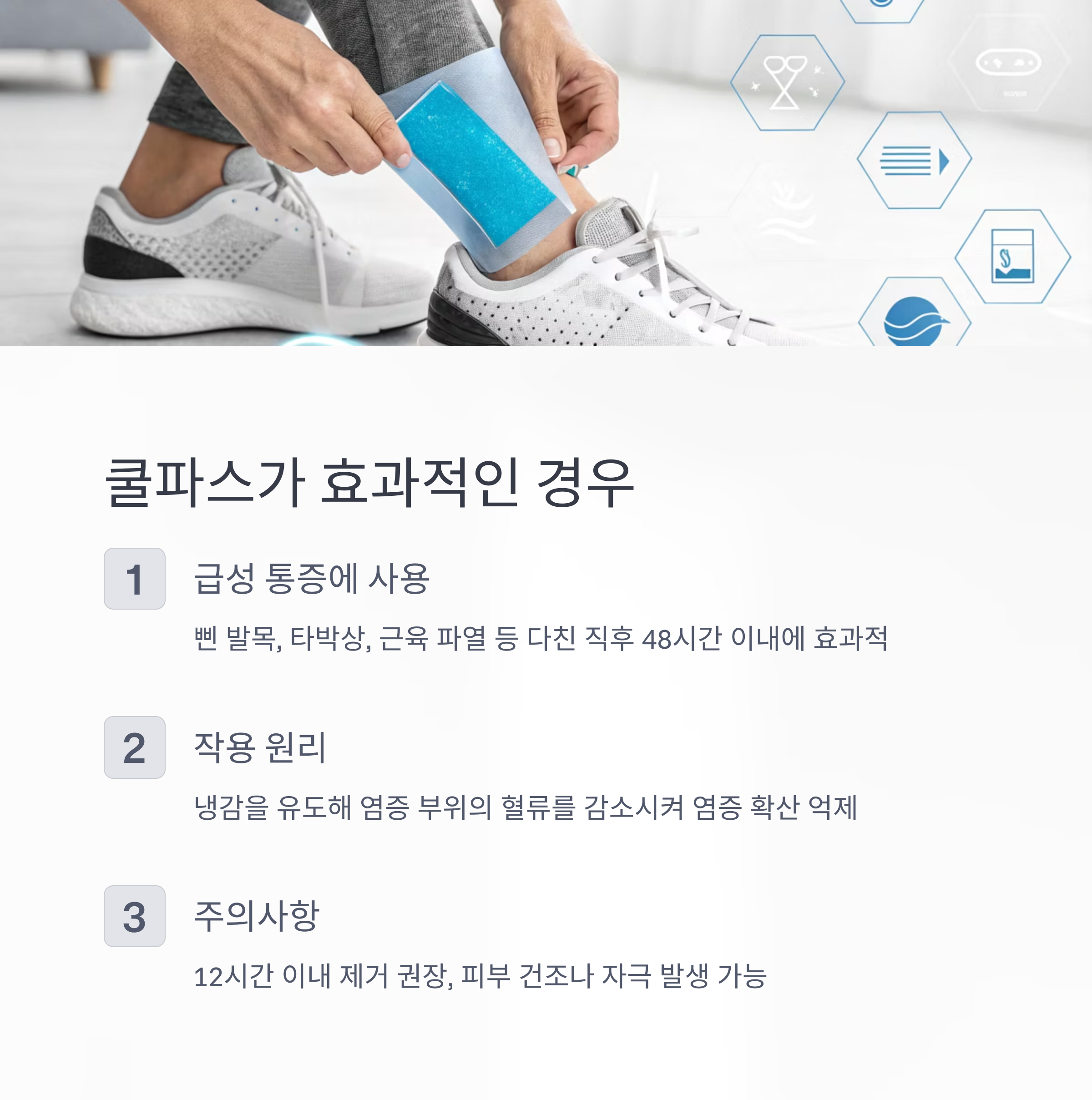 - 다친 직후 48시간 이내에는 쿨파스가 염증 확산을 억제하는 데 가장 효과적입니다