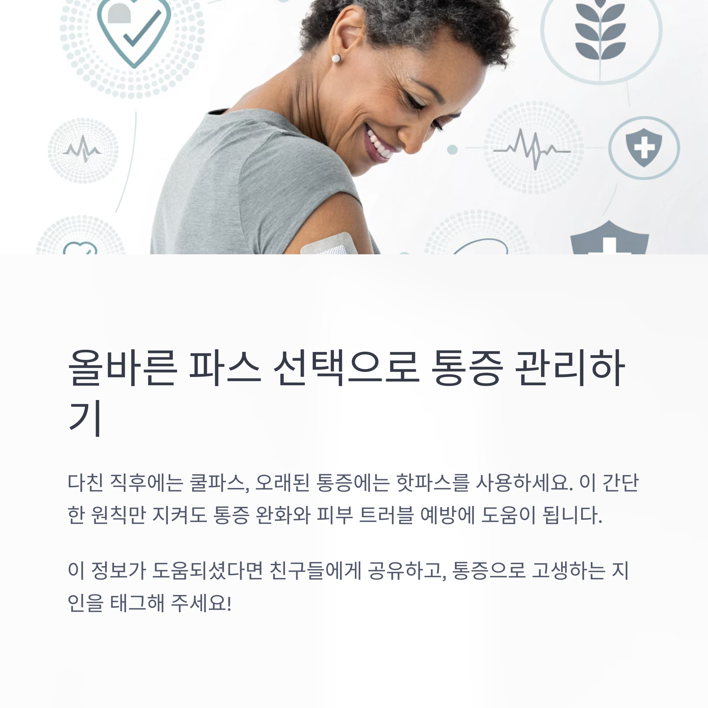 📌 TIP: 파스를 붙인 후에도 통증이 계속되거나 붓기가 심해지면, 사용을 중단하고 병원 진료를 받는 것이 가장 안전한 선택입니다.