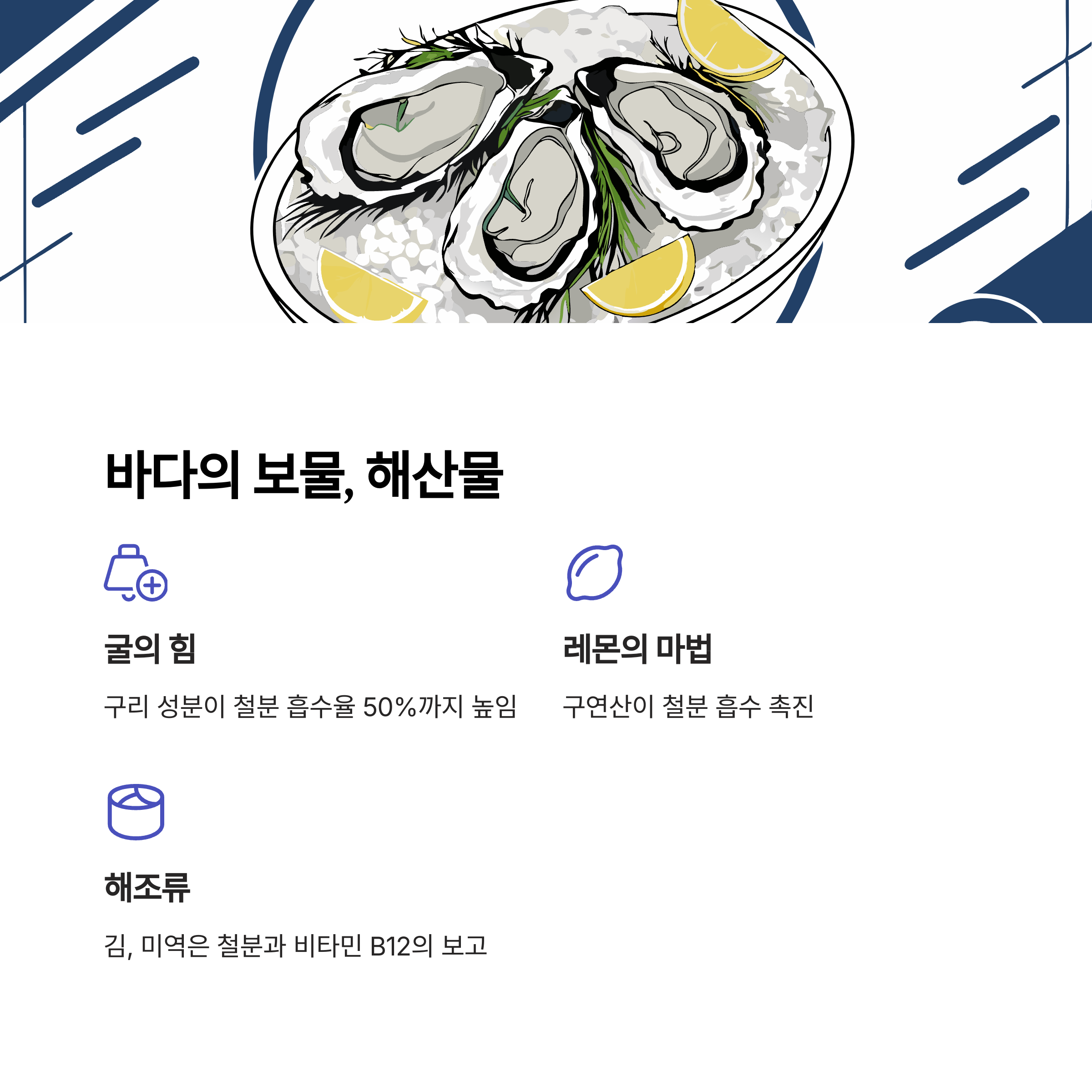 | 흡수율 높은 헴 철분 다량 함유 | 구리와 함께 철분 흡수 돕는 해산물 | 비타민 C와 함께 먹으면 효과 증가 |