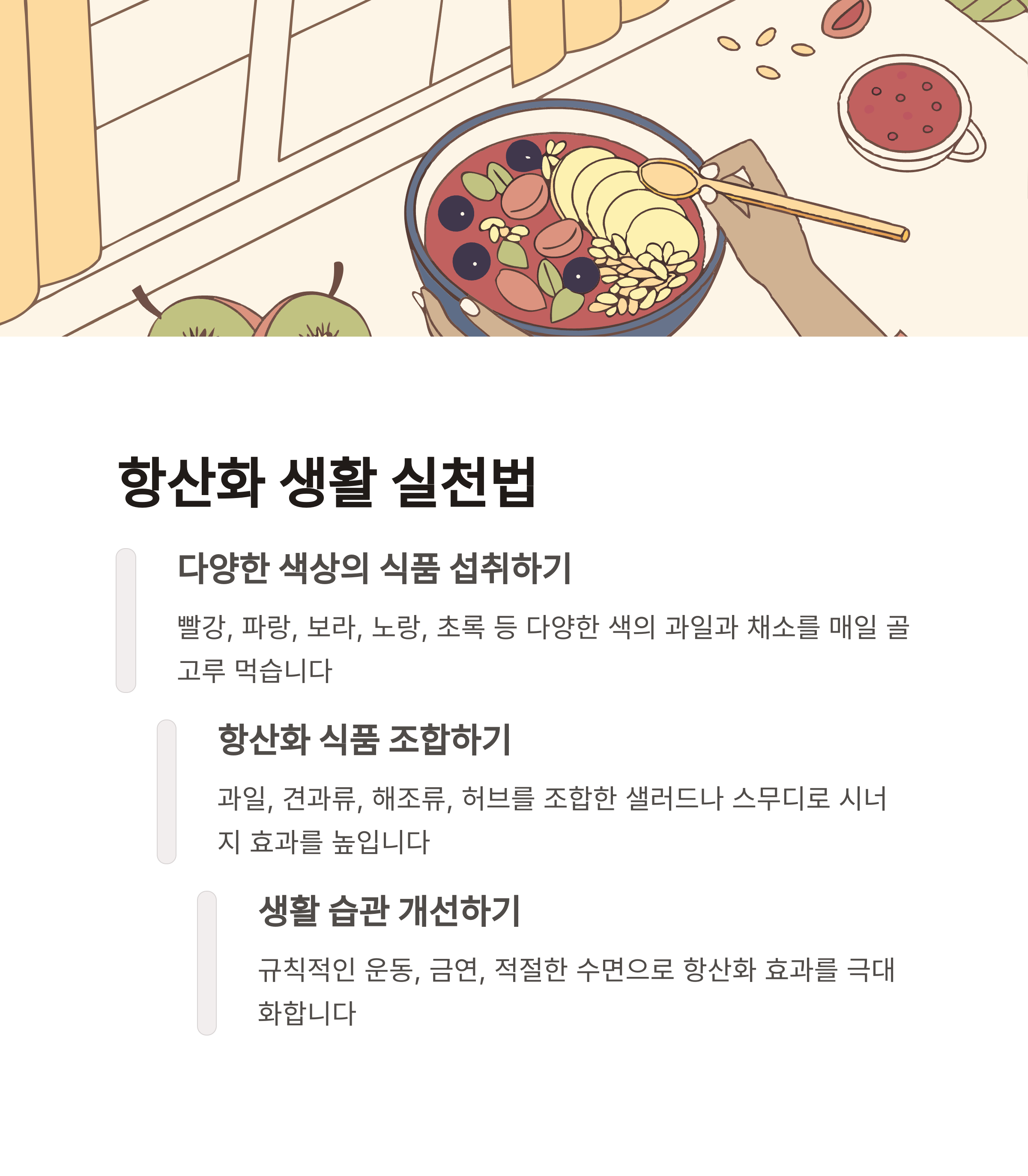 | 비타민C, 비타민E, Q10, 글루타치온 등 | 세포 손상, 염증 유발, 노화 가속 원인 | 과일·채소·견과류 중심 균형 잡힌 섭취 |