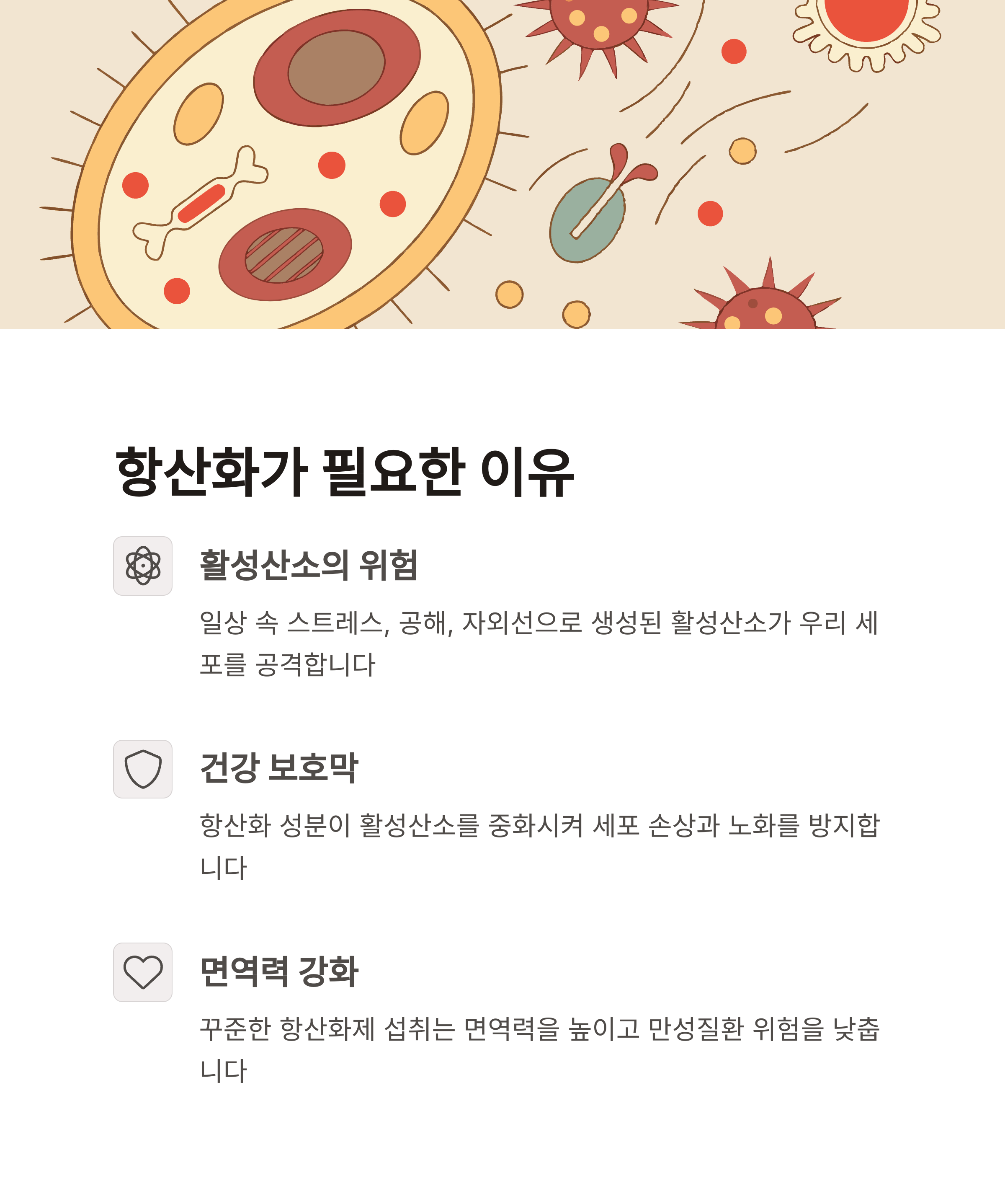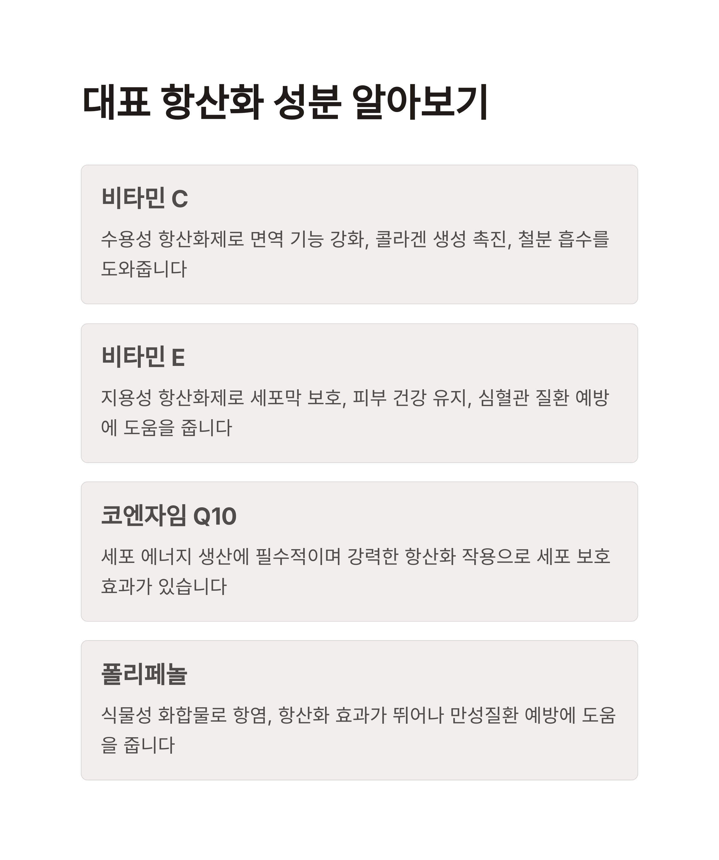 | 복합 섭취 시 효율 극대화 | 자외선, 스트레스, 환경오염 등 원인 | 질병 예방과 건강 수명 연장에 기여 |