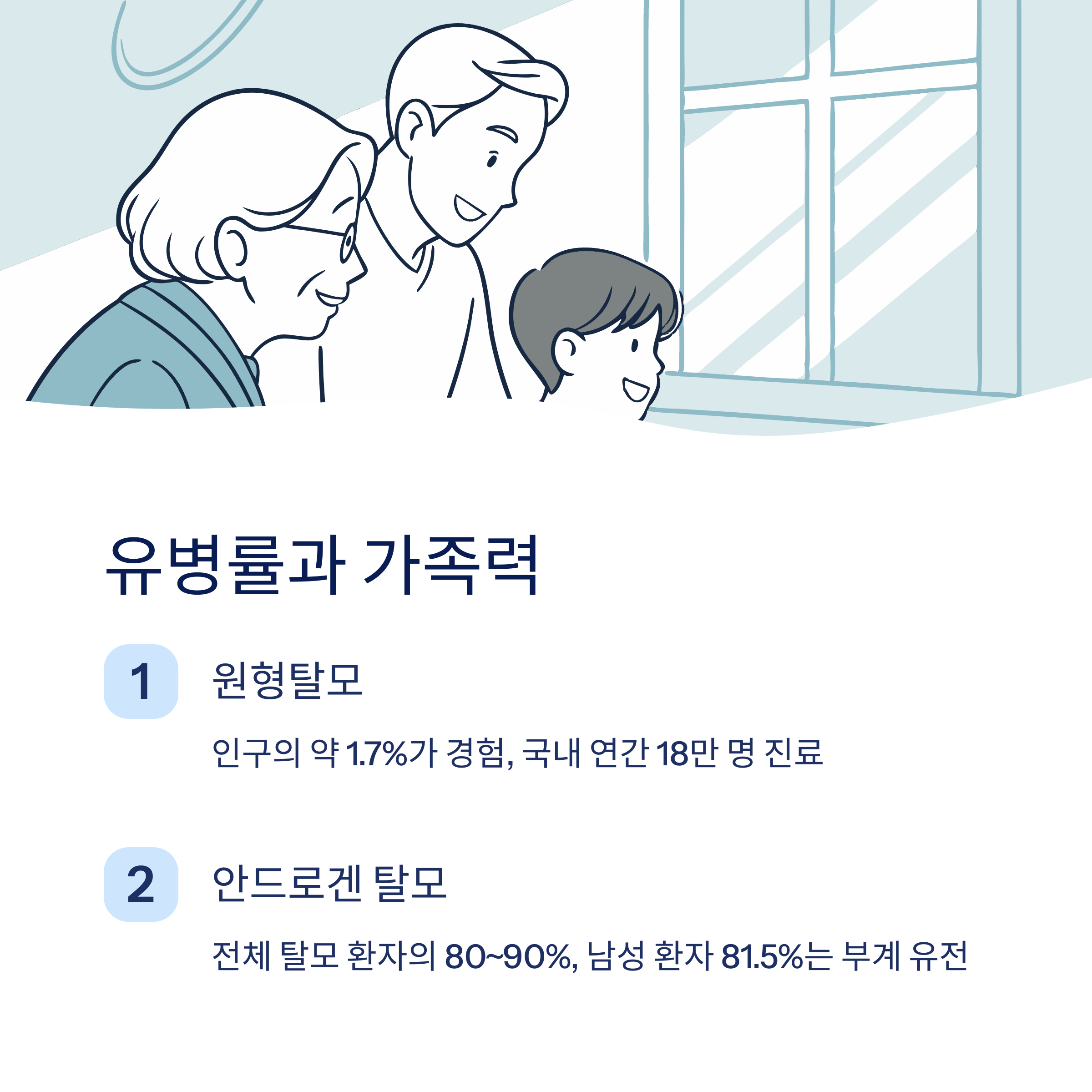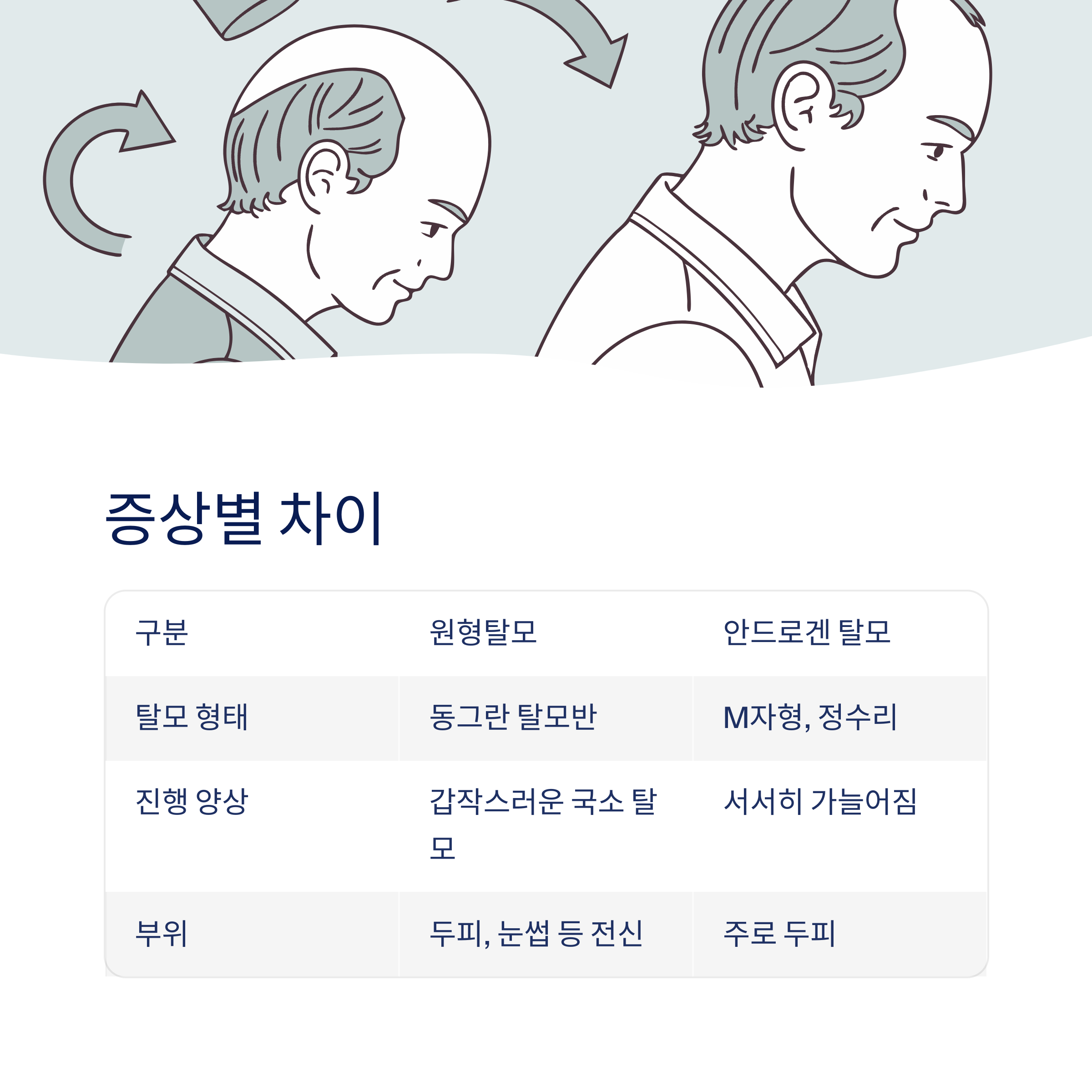 | 탈모 형태 | 동그란 탈모반, 경계 불명확 | 남성: M자형, 정수리 / 여성: 정수리 숱 감소 |