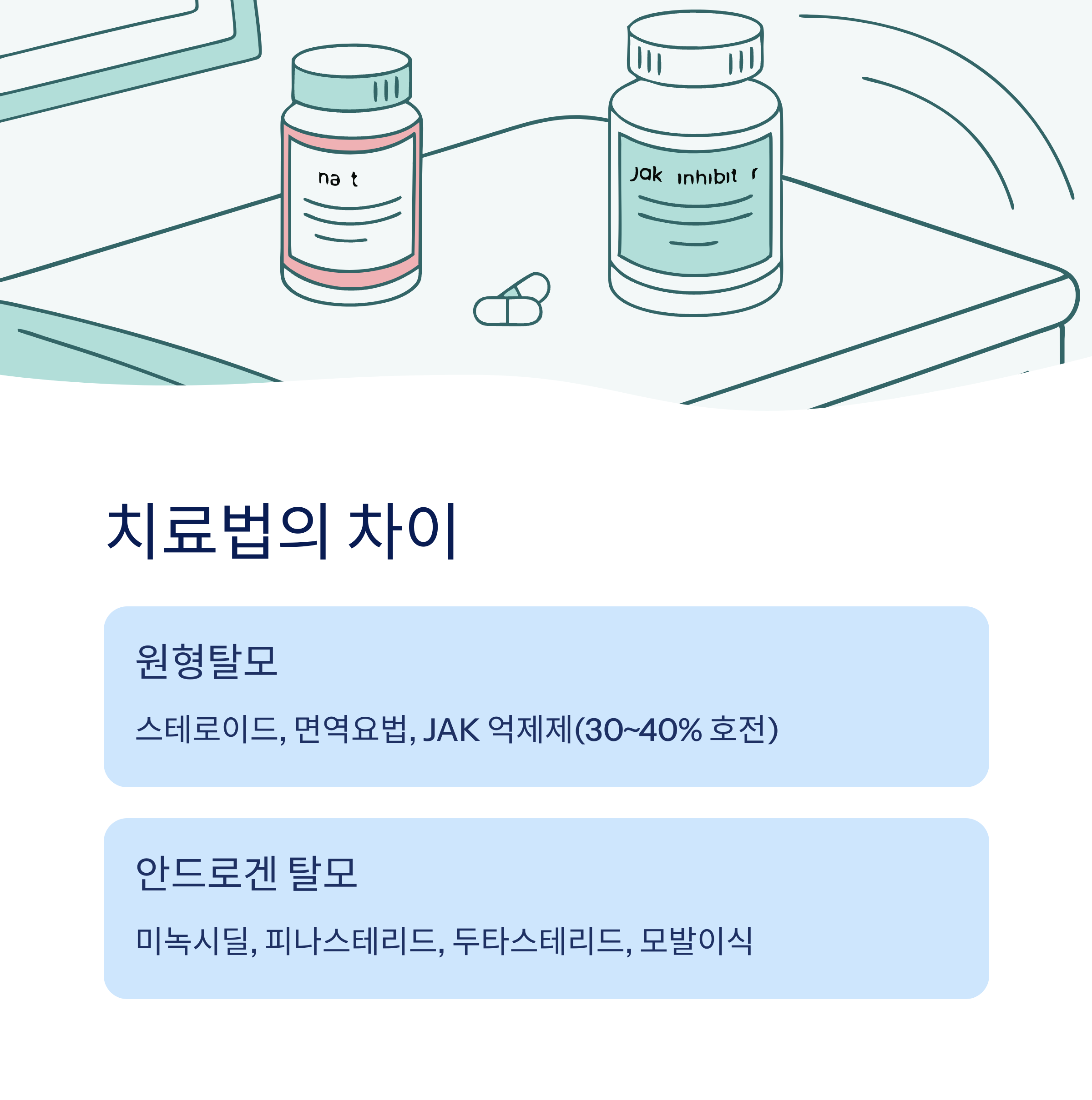 | 기본 치료 | 스테로이드, 미녹시딜, 면역요법, JAK 억제제 | 미녹시딜, 피나스테리드, 두타스테리드 |