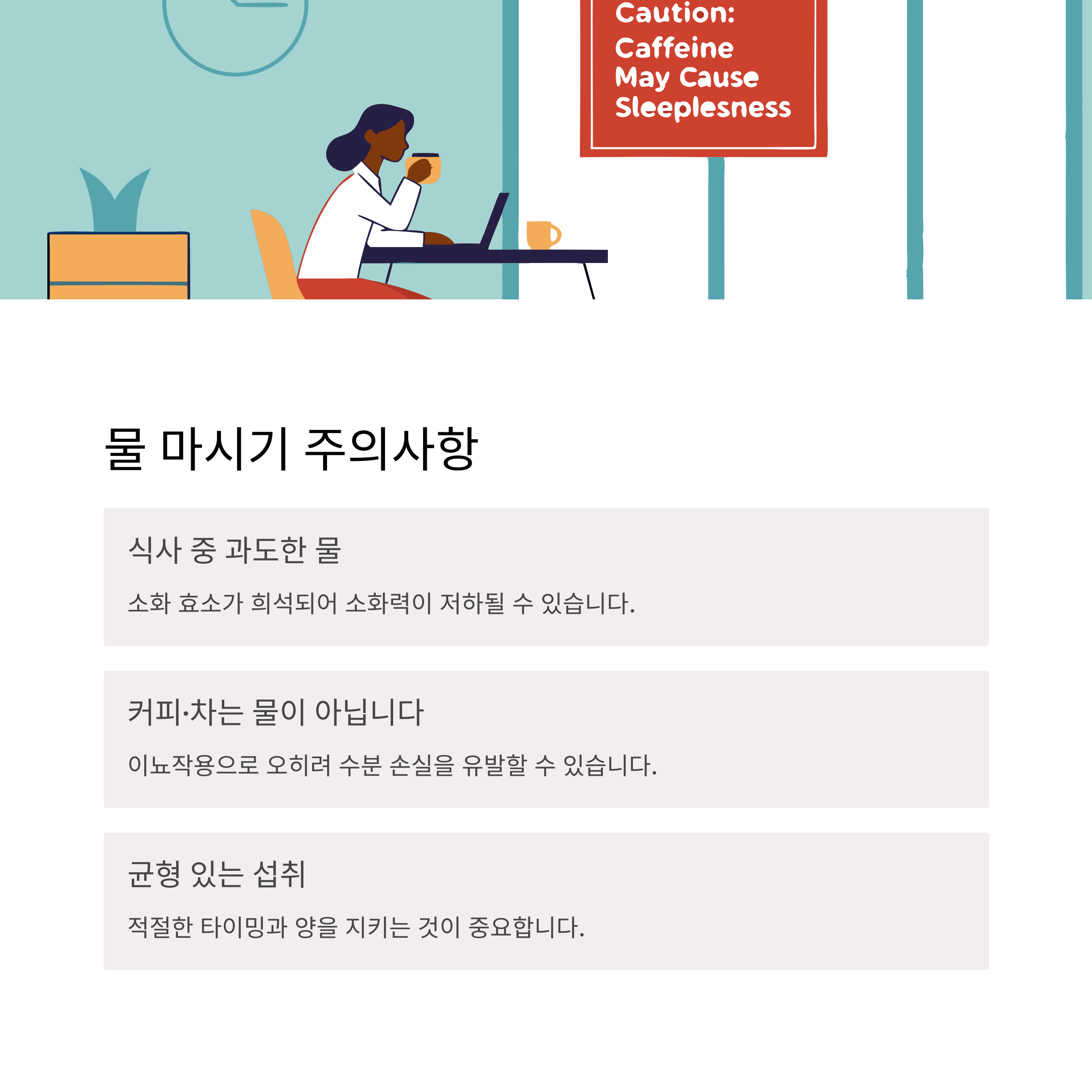| 커피·차를 물로 착각 금지 | 이뇨작용으로 오히려 수분 부족 유발 가능 |