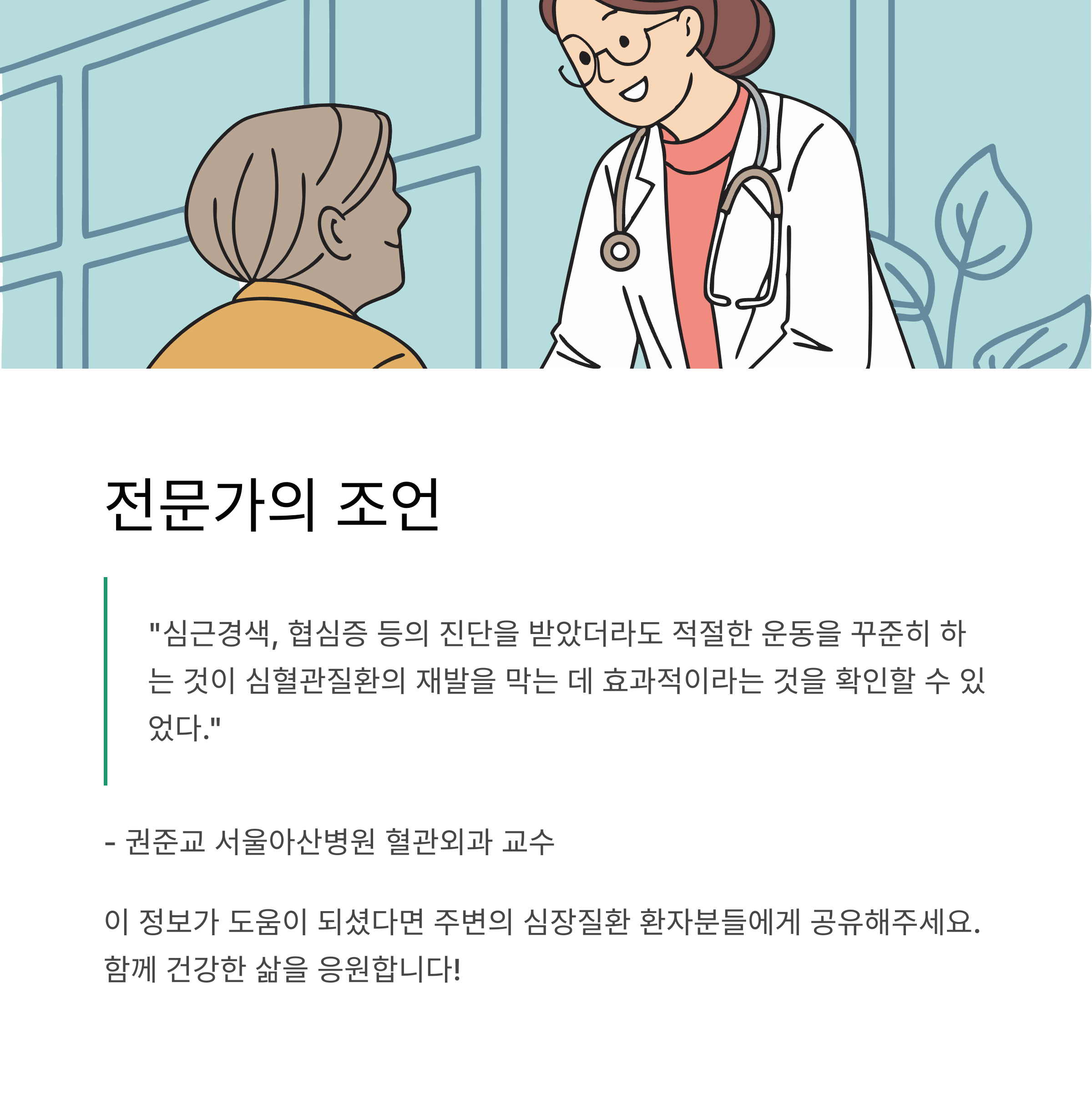 "심근경색, 협심증 등의 진단을 받았더라도 적절한 운동을 꾸준히 하는 것이 심혈관질환의 재발을 막는 데 효과적이라는 것을 확인할 수 있었다. 과도하고 격렬한 운동은 피하고 전문의와 상담을 통해 나이, 질환 정도 등에 따른 맞춤형 운동 계획을 세우는 것이 중요하다."