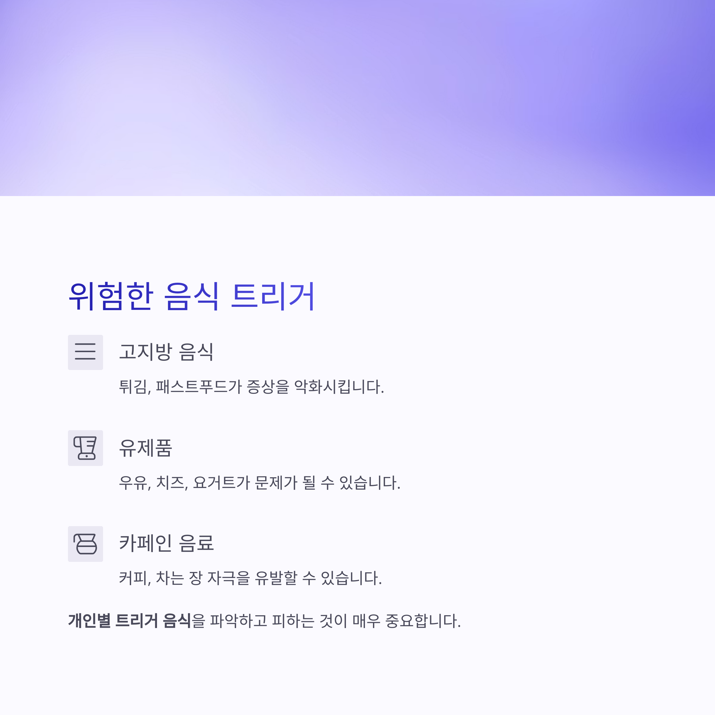| 식이조절 | 트리거 음식 회피, 증상 예방 |